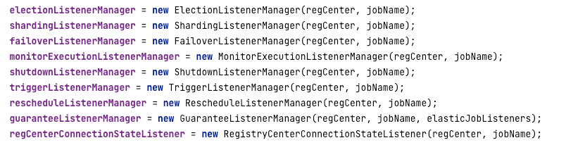创建好对应的节点之后,就要根据不同的业务处理注册事件监听了。在 ElasticJob 中,根据不同的任务会创建如下事件监听管理器,从而完成核心功能: