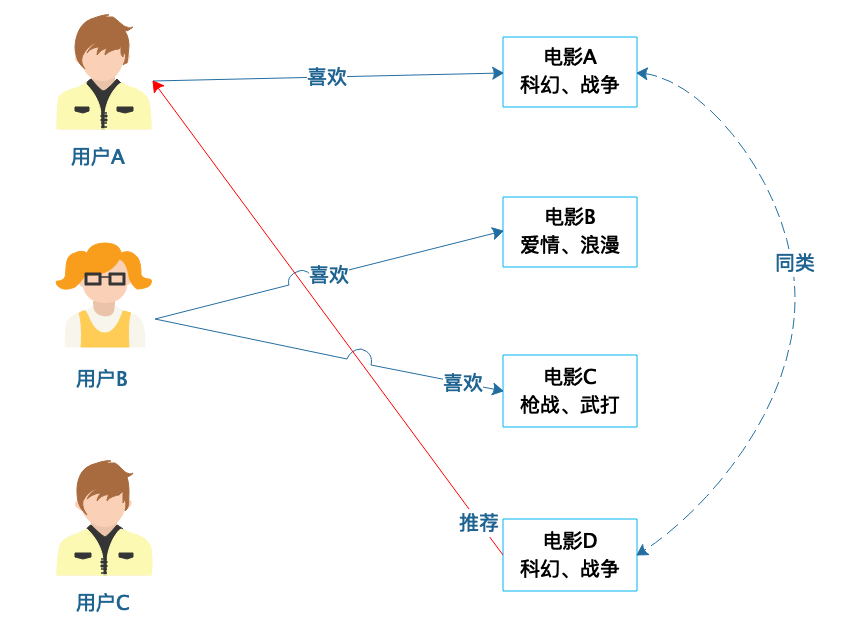 从图中可以看到,电影A和电影D有相似的属性,被划分为同类商品,如果用户A喜欢电影A,那么就可以向用户A推荐电影D,比如给喜欢《星球大战》的用户推荐《星际迷航》。一般来说,相对于基于人口统计的推荐,基于商品属性的推荐会更符合用户的口味,推荐效果相对更好一点。