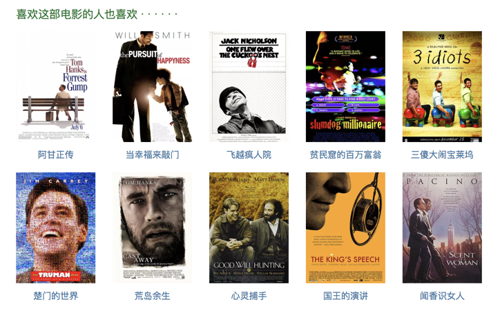 在豆瓣中打开电影《肖申克的救赎》的页面,你会发现这个页面还会推荐一些其他电影。如果你喜欢《肖申克的救赎》,那么有很大概率你也会喜欢下面这些电影,这就是推荐引擎发挥的作用。