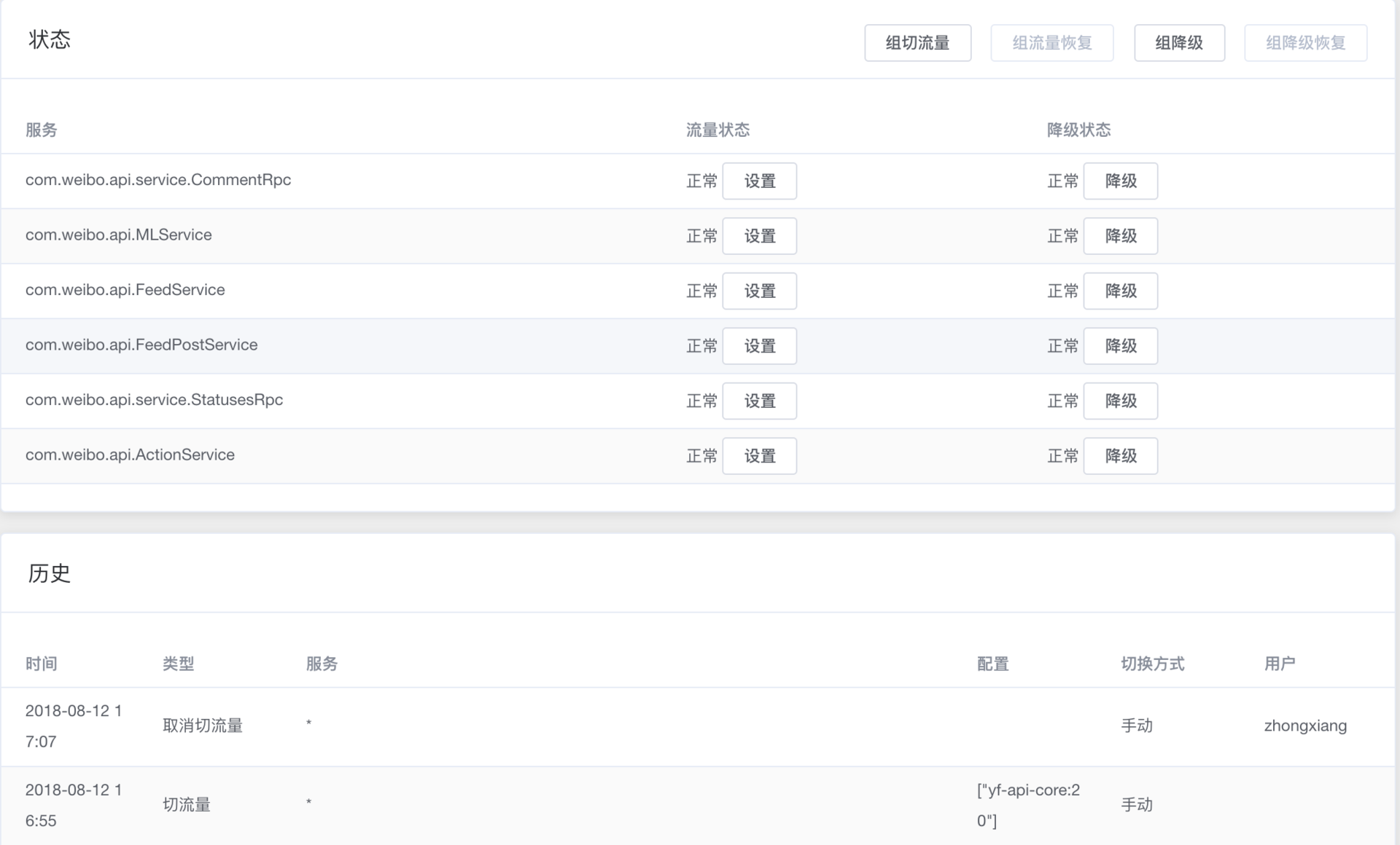 • 服务治理界面,可以进行服务治理操作,比如切流量、降级等,还可以查看操作记录。