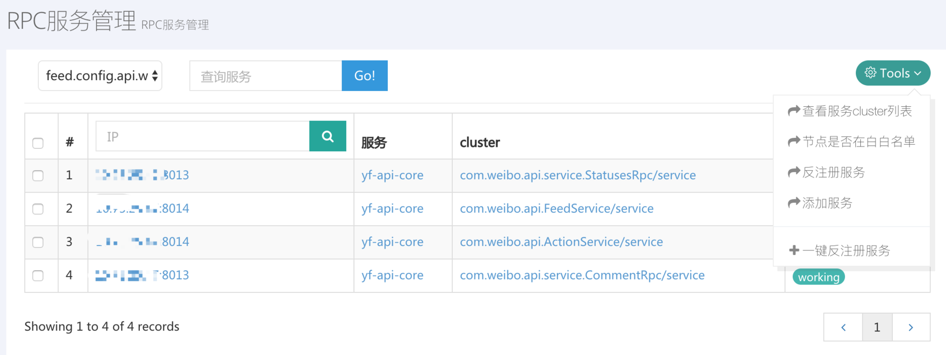 • 服务管理界面,可以进行节点的操作,比如查询节点、删除节点。