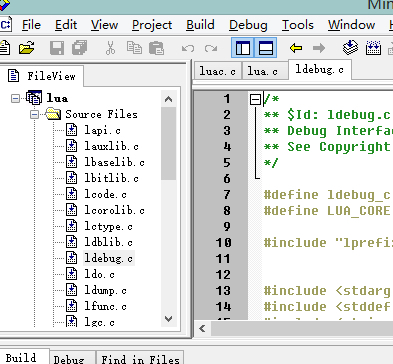 我们可以点击Build->Build选项来进行编译,编译完成后,如果编译成功的话,我们会在Debug目录下看到一个.a文件。如果你的项目名叫lua,那么制作出来的静态库就是liblua.a,所以个文件就是我们以后要用到Lua静态库。