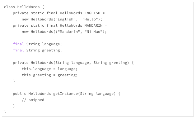 还记得以前我们用到的,在不同的语言环境下,该怎么打招呼的代码吗?上一次,我们把它改成了不可变的类,避免了线程同步的问题。我把这段代码重新抄录在下面。