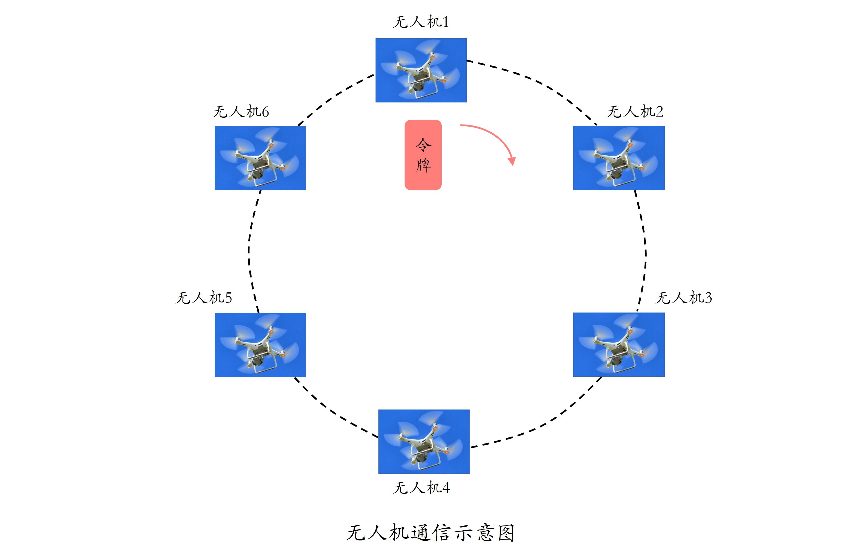 如下图所示,所有的无人机组成一个环,按照顺时针方向通信。每个无人机只知道其前一个发送信息的无人机,和后一个将要接收信息的无人机。拥有令牌的无人机可以向外发送信息,其他无人机只能接收数据。拥有令牌的无人机通信完成后,会将令牌传送给后一个无人机。