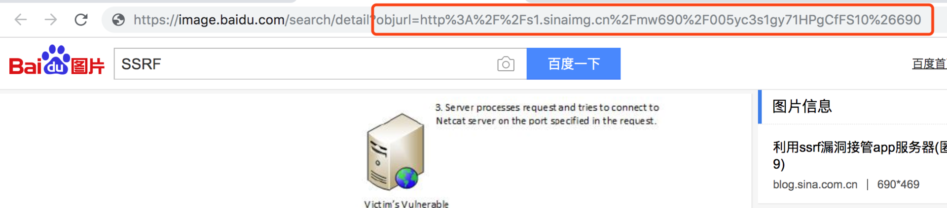 比方说,当我们在百度中搜索图片时,会涉及图片的跨域加载保护,百度不会直接在页面中加载图片的源地址,而是将地址通过GET参数提交到百度服务器,然后百度服务器请求到对应的图片,再返回到页面展示出来。