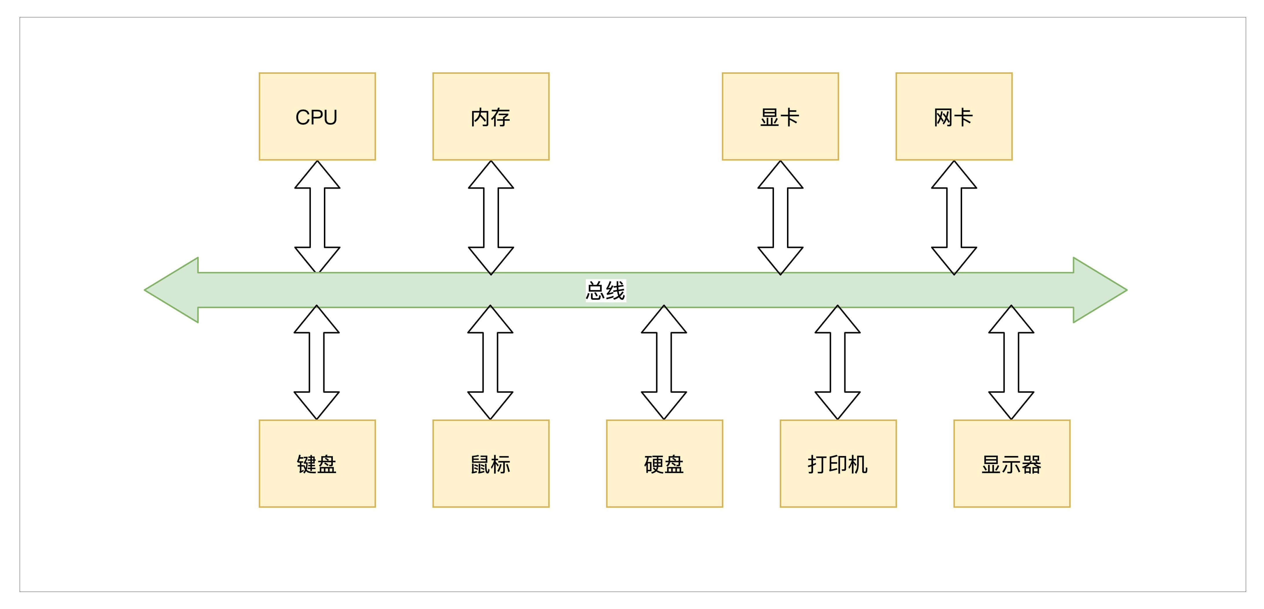 1.总线,负责连接各种其它设备,是其它设备工作的基础。- 2.CPU,即中央处理器,负责执行程序和处理数据运算。- 3.内存,负责储存运行时的代码和数据。- 4.硬盘,负责长久储存用户文件数据。- 5.网卡,负责计算机与计算机之间的通信。- 6.显卡,负责显示工作。- 7.各种I/O设备,如显示器,打印机,键盘,鼠标等。