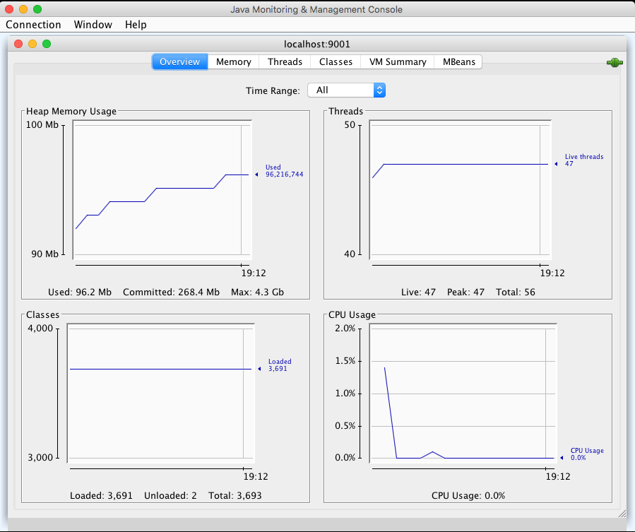 前面我提到的需要监控的关键指标有吞吐量、响应时间、错误数、线程池、CPU以及JVM内存,接下来我们就来看看怎么在JConsole上找到这些指标。