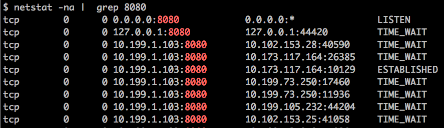 4.查看Tomcat的网络连接,比如Tomcat在8080端口上监听连接请求,通过下面的命令查看连接列表: