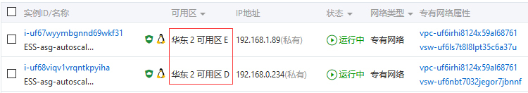 在ECS控制台,你也可以清楚地看到,这两台机器被自动分配到了不同的可用区中,分属不同的交换机: