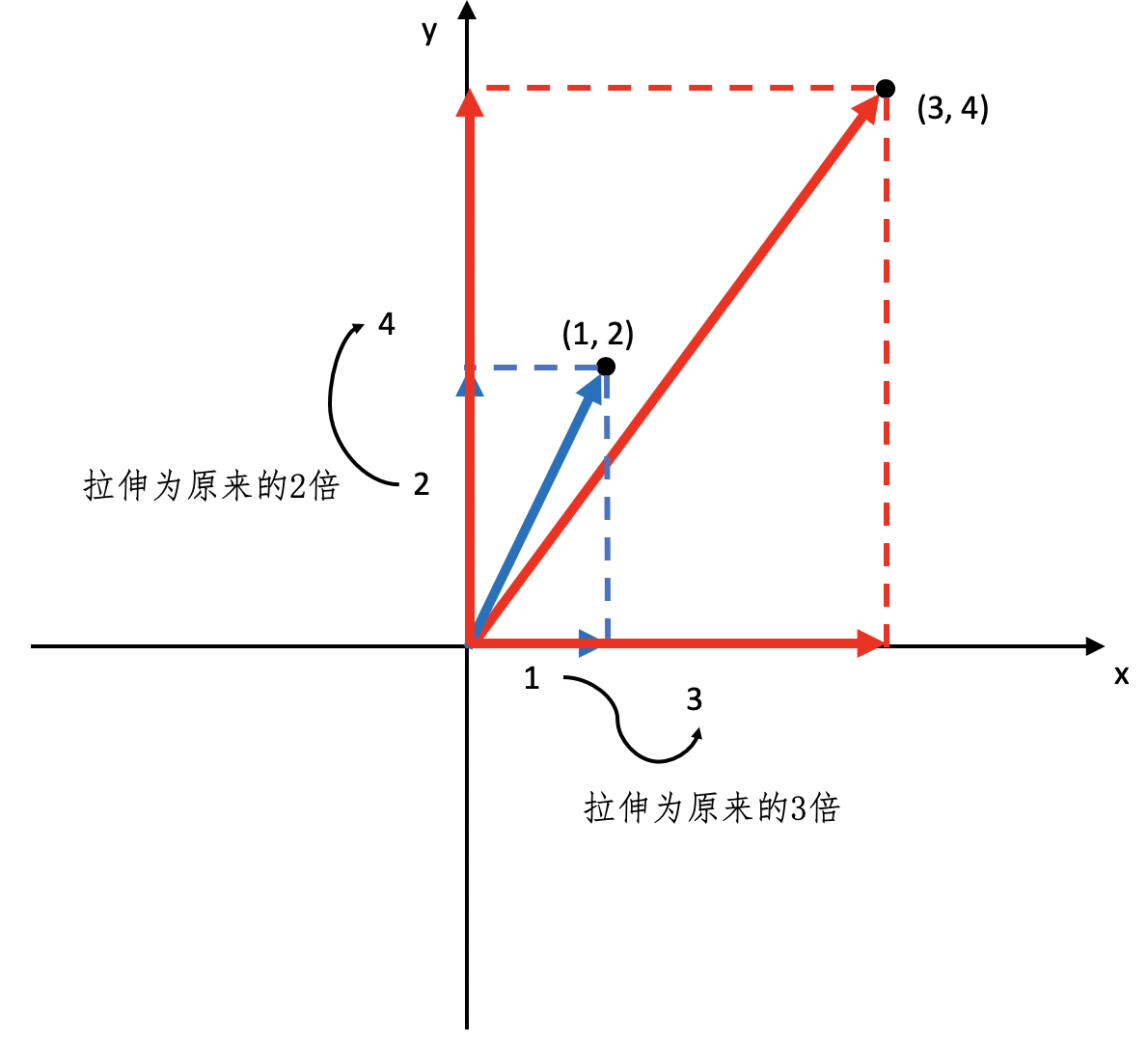 我们还可以从另一个角度来验证这点,把从原点到\((3, 4)\)的直线进行分解,我们会发现这个直线在\(x\)轴上投影的长度为3,为原来的3倍,而在\(y\)轴上投影的长度为4,为原来的2倍。