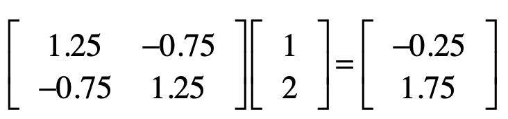 根据我们之间的解释,如果让这个矩阵\(X\_2\)左乘任何一个向量,就是让向量沿\(\[\\frac{1}{\\sqrt{2}} \\frac{1}{\\sqrt{2}}\]\)方向压缩一半,而在\(\[\\frac{1}{\\sqrt{2}} \\frac{-1}{\\sqrt{2}}\]\)方向增加两倍。为了验证这一点,我们让\(X\_2\)左乘向量\((1, 2)\),获得新向量:
