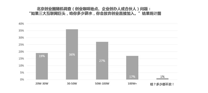 认清了这个现实,我们明白了这十年的青春是十分有价的。所以这时有人说了,要去创业,才有可能突破。前两年(2015)都在鼓励万众创业,但真实的现实是,你要给目前的万众创业者一个稳定的七八十万年薪,80%+ 的创业者表示就会放弃创业了,这数据是来自 TOMsInsight 深度观察文《互联网乱世之下,那些人才流动中的心酸和无奈》对 100 个创业者的抽样调查。-