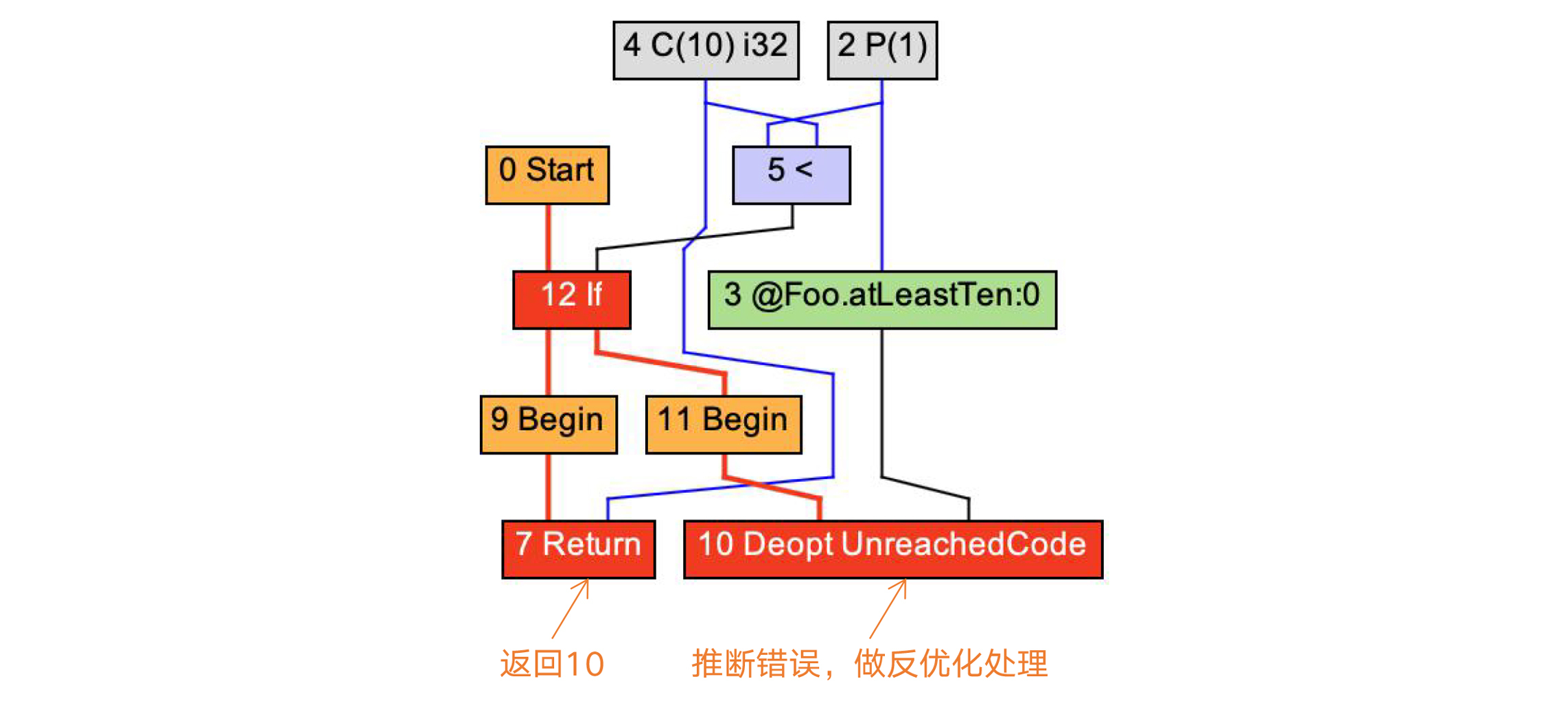 而如果遇到小于10的情况,则会导致逆优化。你会看到,IR中有一个绿色的FrameState节点,这个节点保存了栈帧的状态,在逆优化时会被用到。