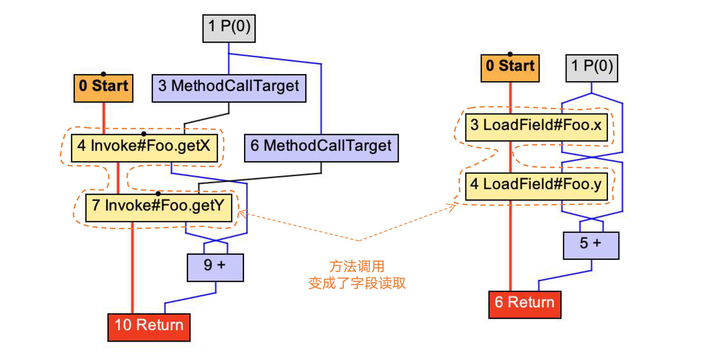 在做了Lower处理以后,LoadField会被展开成更底层的操作:根据x和y的地址相对于对象地址的偏移量,获取x和y的值。