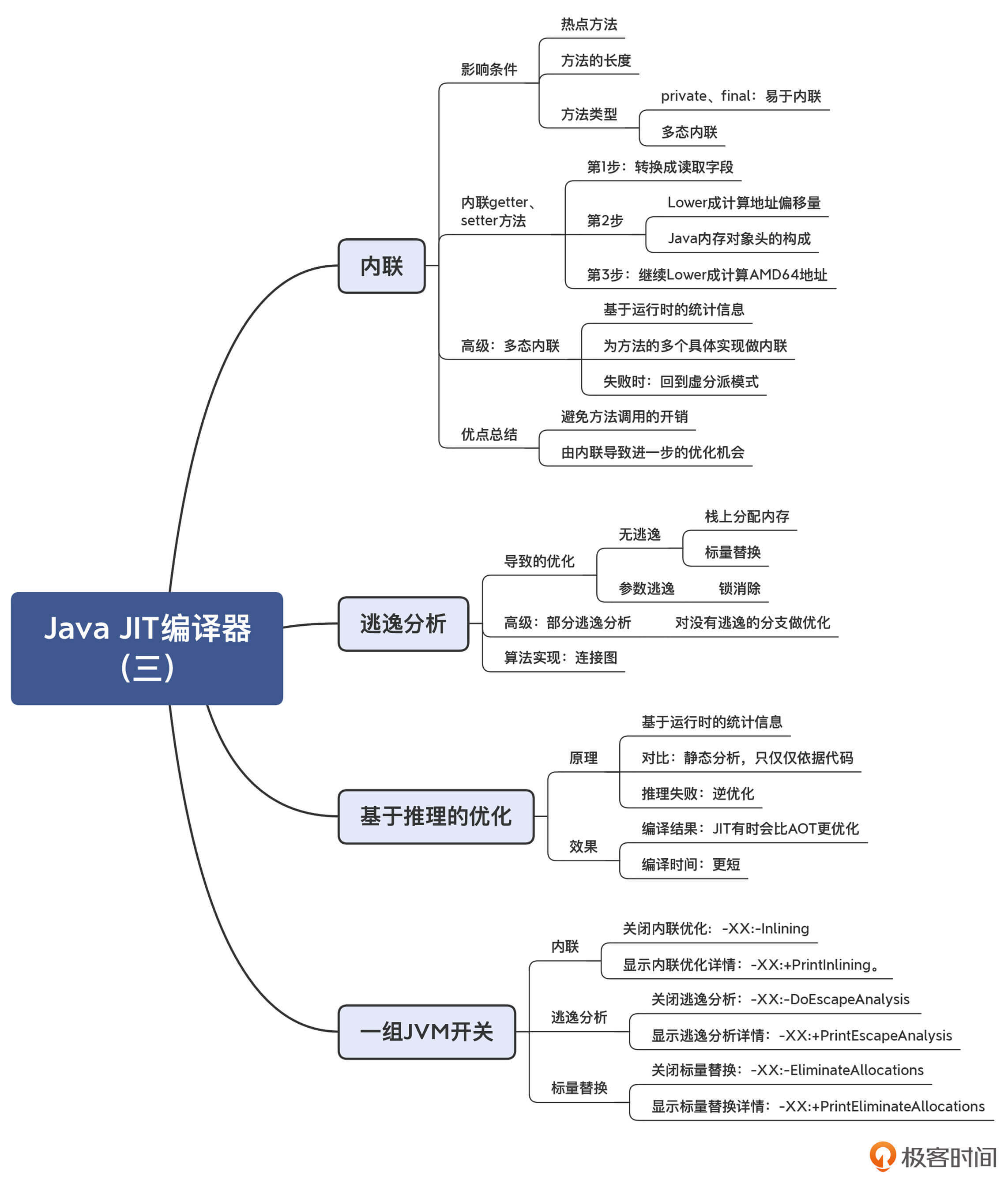另外,熟悉这些重要的优化算法的原理,还有助于你写出性能更高的程序。比如说,你要让高频使用的代码易于内联;在使用对象的时候,让它的作用范围清晰一些,不要做无用的关联,尽量不要逃逸出方法和线程之外,等等。