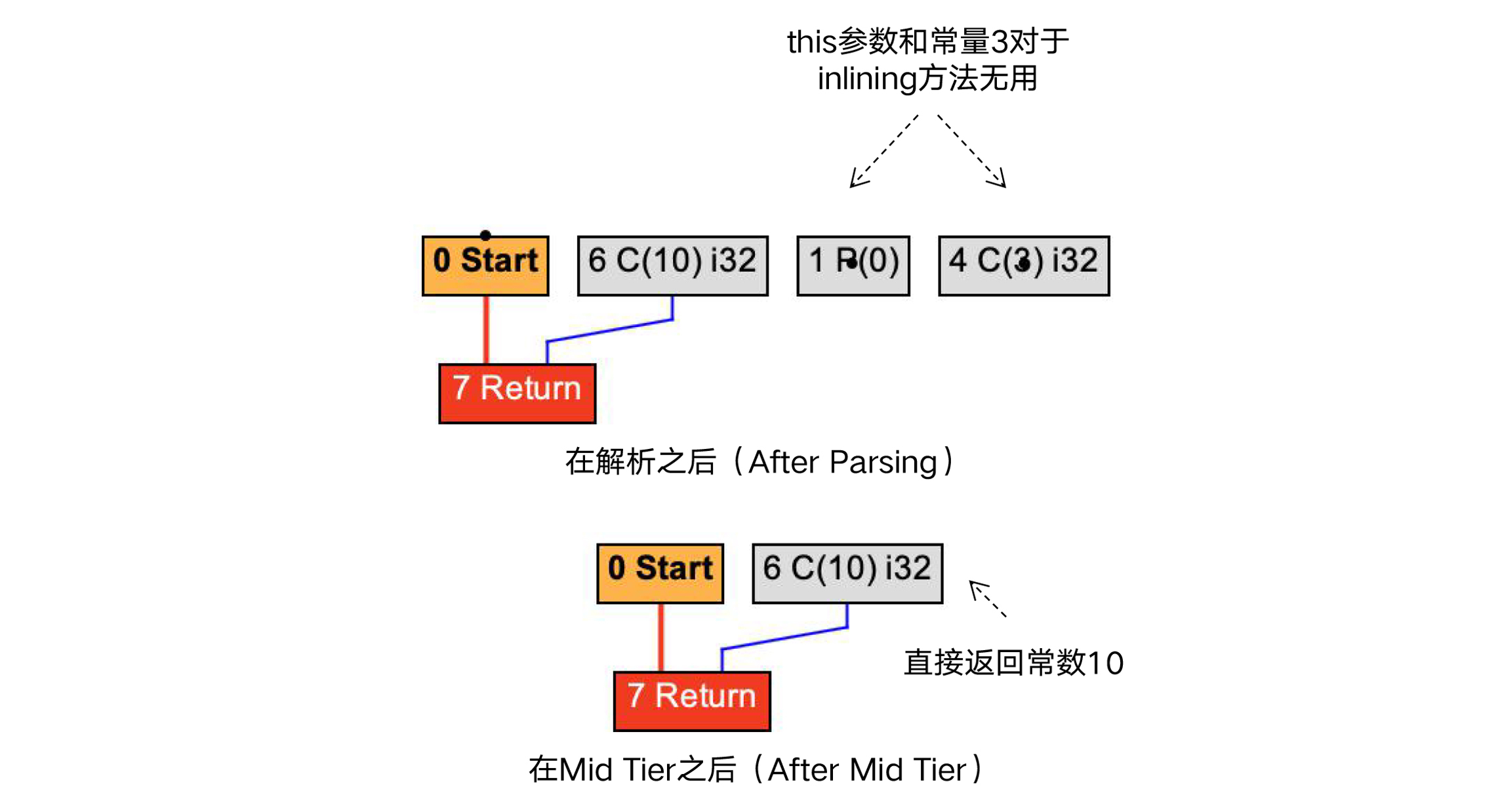 而一旦启用了内联选项,就可以触发一系列的优化。在把字节码解析生成IR的时候,编译器就启动了内联分析过程,从而会发现this参数和常量3对于inliningTest方法根本是无用的,在图里表现成了一些孤岛。在Mid Tier处理完毕之后,inliningTest方法就直接返回常量10了。