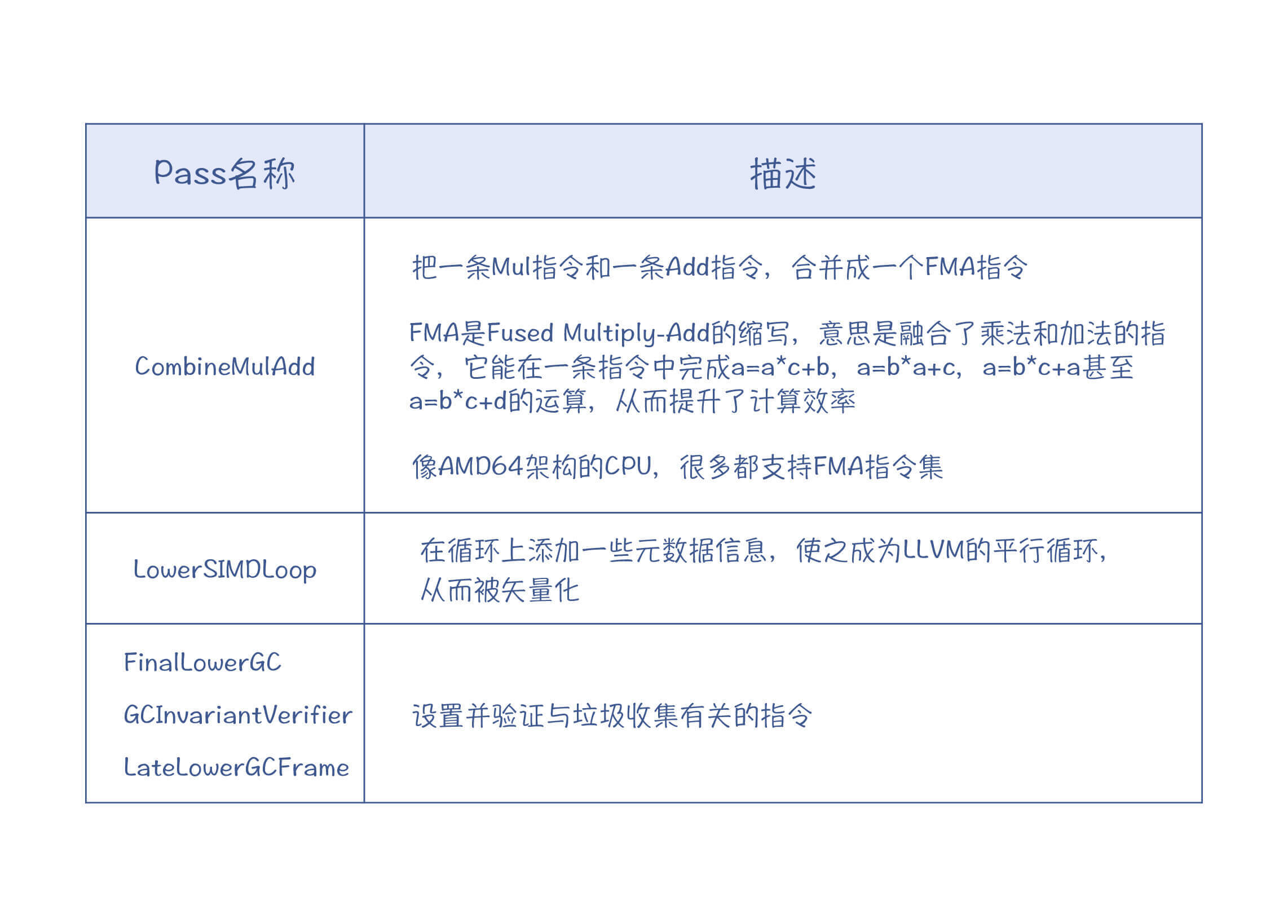 这些个性化的Pass是针对Julia本身的语言特点而编写的。比如对于垃圾收集,每种语言的实现策略都不太一样,因此就必须自己实现相应的Pass,去插入与垃圾收集有关的代码。再比如,Julia是面向科学计算的,比较在意数值计算的性能,所以自己写了两个Pass来更好地利用CPU的一些特殊指令集。