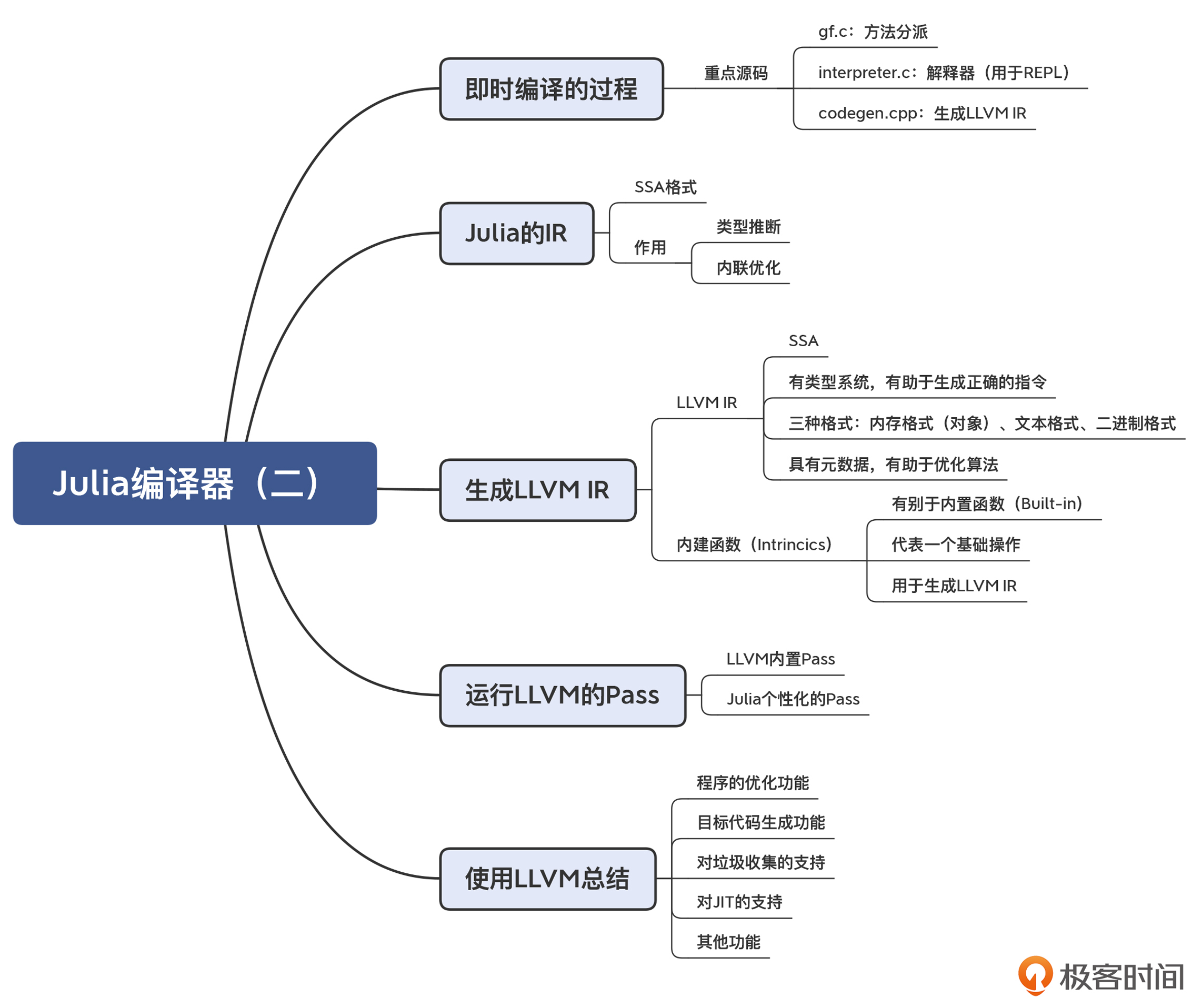 今天这一讲,我们主要研究了Julia如何实现中后端功能的,特别是在这个过程中,它是如何使用LLVM的,你要记住以下要点: