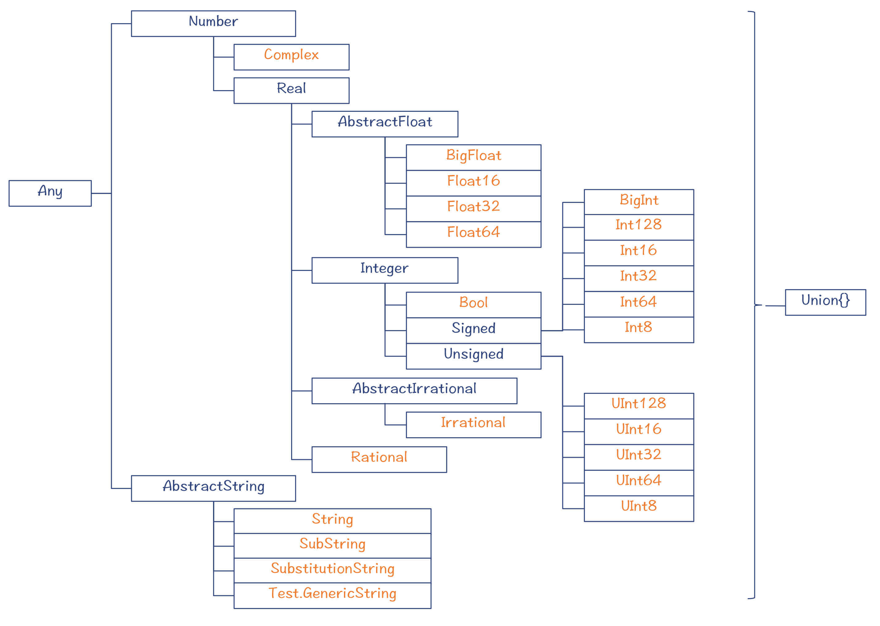Julia设计了一个精巧的类型体系。这个类型体系有着共同的根,也就是Any。在这个类型层次中,橙色的类型是叶子节点,它们是具体的类型,也就是可以创建具体的实例。而中间层次的节点(蓝色),都是抽象的,主要是用于类型的计算。
