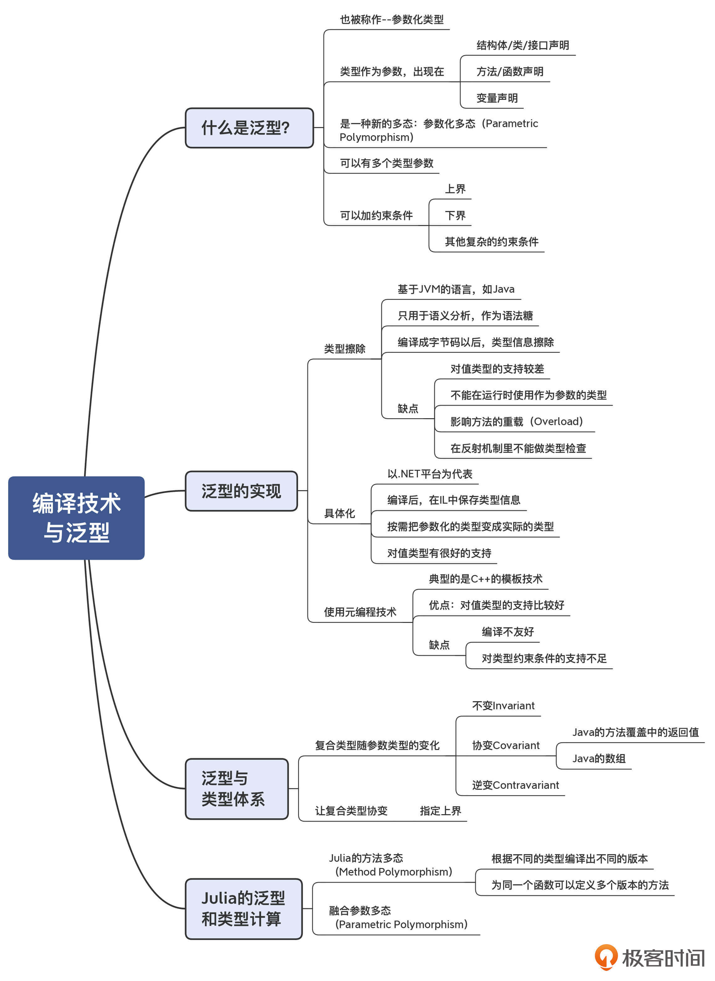 那么,泛型有哪些特点?在设计和实现上有哪些不同的方案?编译器应该进行什么样的配合呢?今天这一讲,我就带你一起探讨泛型的实现原理,借此加深你对编译原理相关知识点的认知,让你能够在自己的编程中更好地使用泛型技术。
