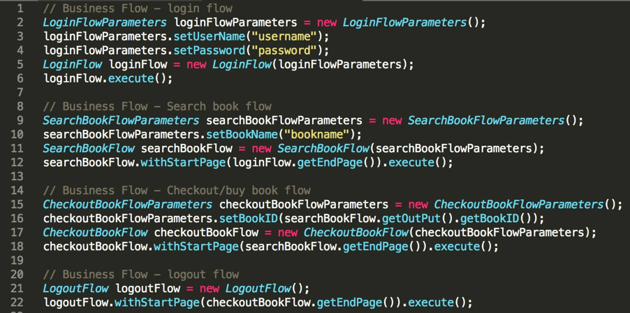 首先,从整体结构上看,段伪代码顺序调用了4个业务流程, 依次是完成用户登录的LoginFlow、完成书籍查询的SearchBookFlow、完成书籍购买的CheckoutBookFlow、完成用户登出的LogoutFlow。
