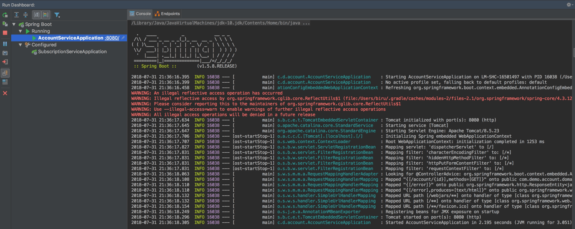 我推荐使用IntelliJ打开这个下载的项目,然后直接启动其中的account-service。启动成功后,account-service会运行在本地机器的8080端口。启动成功后的界面如图3所示。