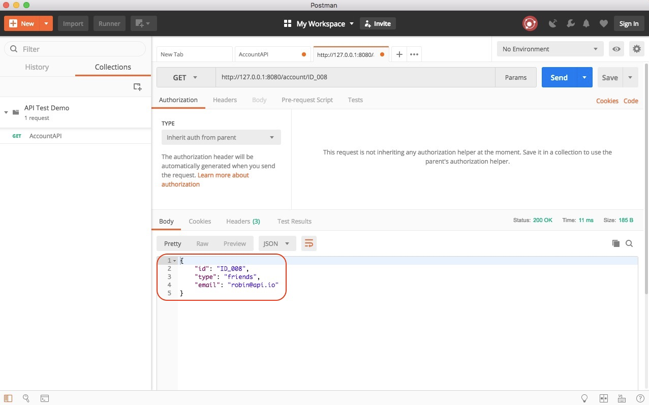 我建立了“API Test Demo”的Collection,并且将刚才的测试request命名为“AccountAPI”保存到这个Collection中。