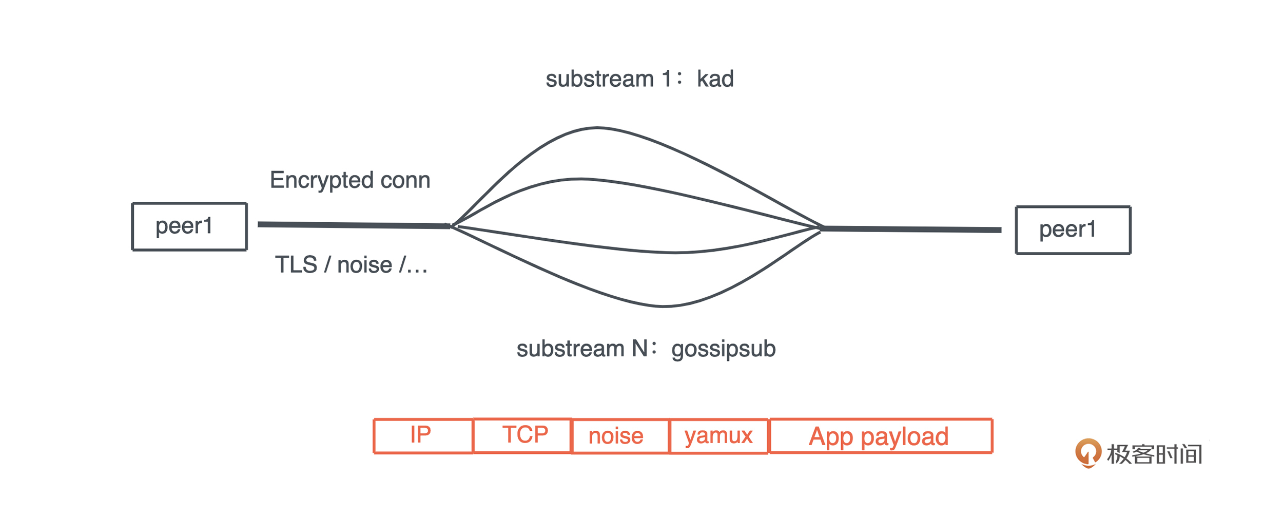 所以我们会看到,P2P 协议的连接,往往在一个 TCP 连接中,使用类似 yamux 的多路复用协议来承载很多其他协议:-
