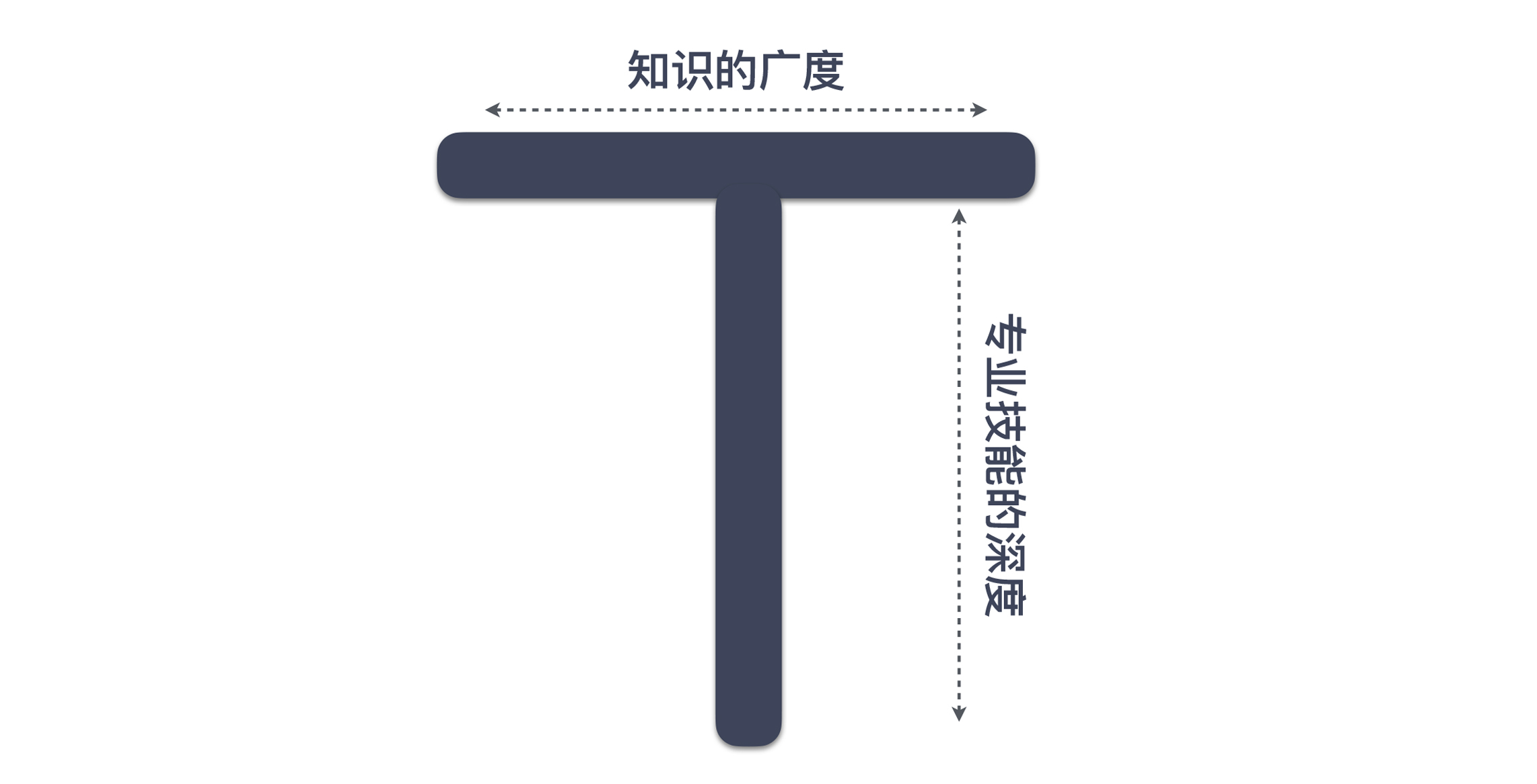 我们再来回答下一个问题:目标是什么。也许这时候,每个人脑子里想到的职业发展路线都不一样,但我准备用一个统一的目标回答你:成为 T 型人。