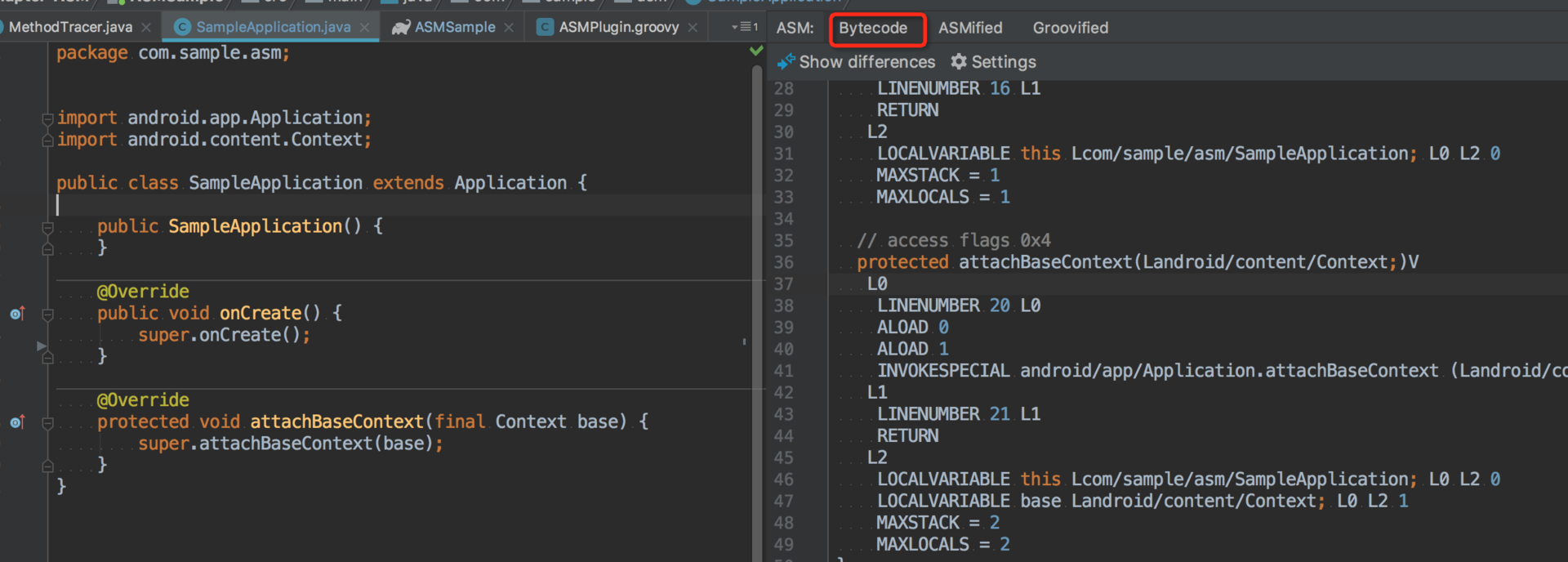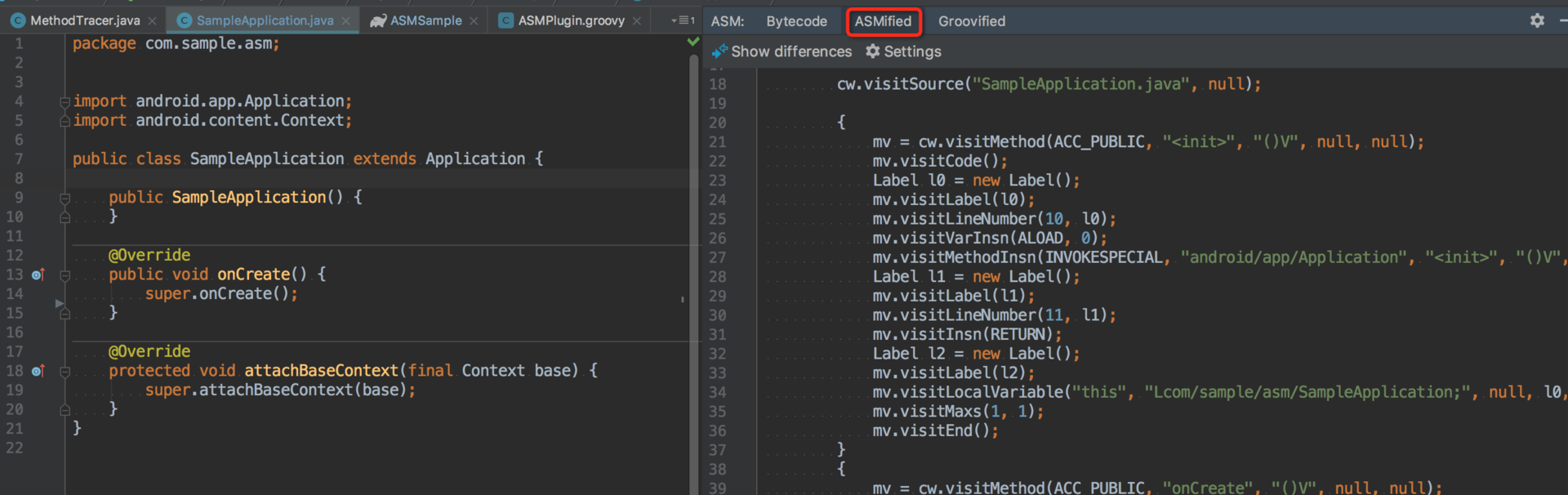 除了字节码模式,ASM Bytecode Outline还有一种“ASMified”模式,你可以看到SampleApplication类应该如何用ASM代码构建。