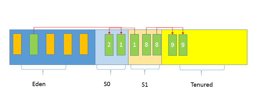 第一,Java应用不断创建对象,通常都是分配在Eden区域,当其空间占用达到一定阈值时,触发minor GC。仍然被引用的对象(绿色方块)存活下来,被复制到JVM选择的Survivor区域,而没有被引用的对象(黄色方块)则被回收。注意,我给存活对象标记了“数字1”,这是为了表明对象的存活时间。-