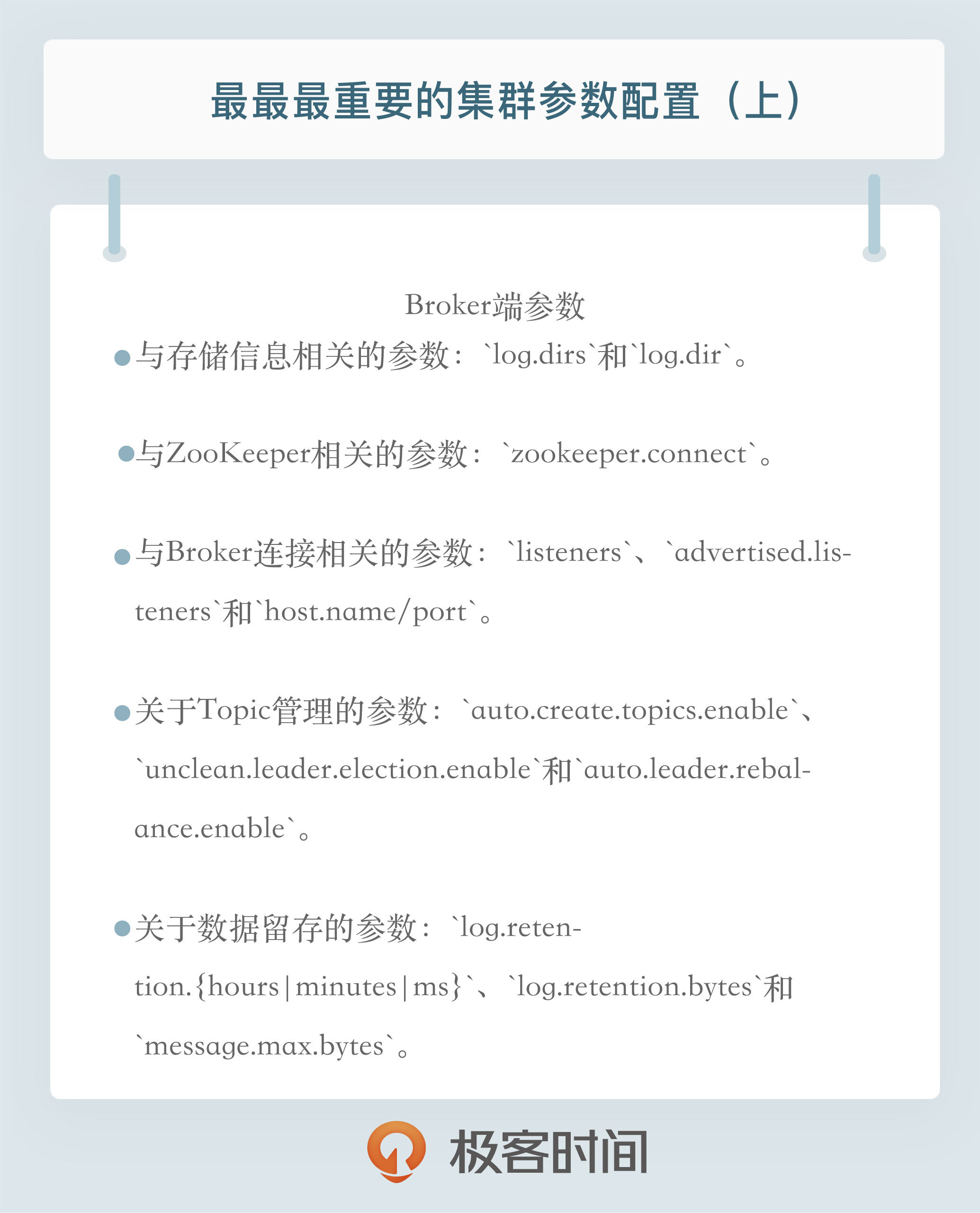 再次强调一下,今天我和你分享的所有参数都是那些要修改默认值的参数,因为它们的默认值不适合一般的生产环境。当然,我并不是说其他100多个参数就不重要。事实上,在专栏的后面我们还会陆续提到其他的一些参数,特别是那些和性能息息相关的参数。所以今天我提到的所有参数,我希望作为一个最佳实践给到你,可以有的放矢地帮助你规划和调整你的Kafka生产环境。