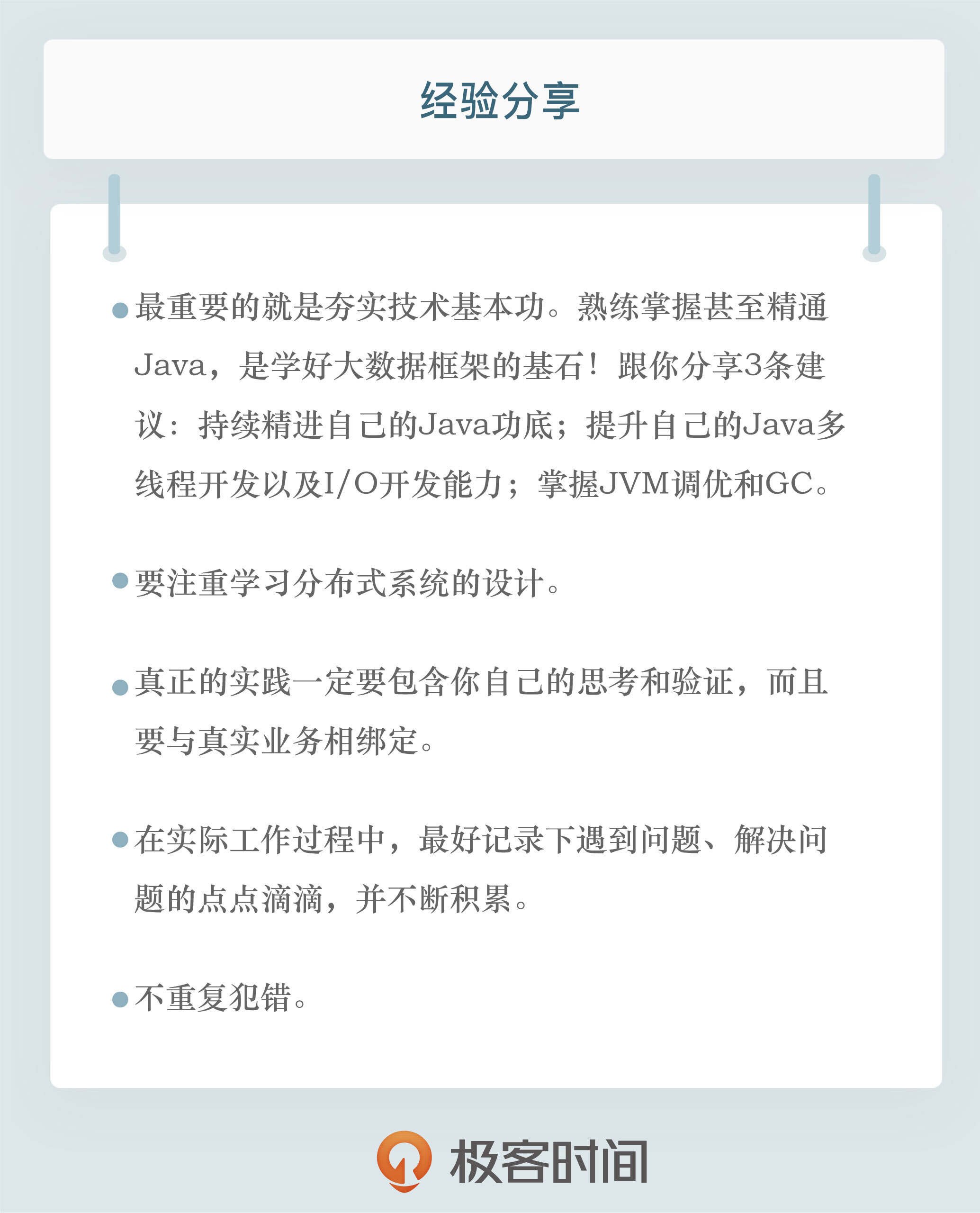 另外,在实际学习过程中,你最好记录下遇到问题、解决问题的点点滴滴,并不断积累。要知道,很多技术大家之所以成为技术大家,不仅仅是因为理论掌握得很牢固,填过的“坑”多,更重要的是,他们不重复犯错。