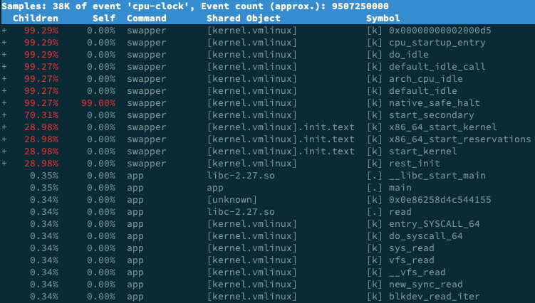 所以,分析案例时,我们直接忽略了前面这个 99% 的符号,转而分析后面只有 0.3% 的 app。其实从这里你也能理解,为什么我们一开始不先用 perf 分析。