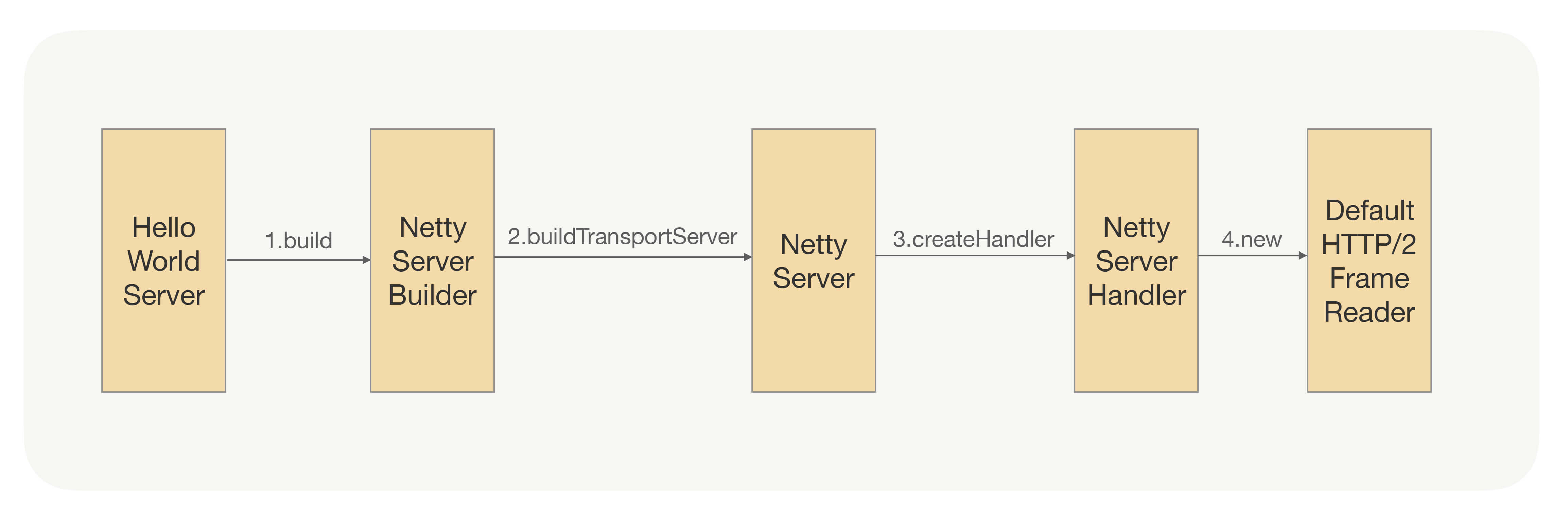 这四个步骤是用来开启一个 Netty Server,并绑定编解码逻辑的,如果你暂时看不懂,没关系的,我们可以先忽略细节。我们重点看下 NettyServerHandler 就行了,在这个 Handler 里面会绑定一个 FrameListener,gRPC 会在这个 Listener 里面处理收到数据请求的 Header 和 Body,并且也会处理 Ping、RST 命令等,具体流程如下图所示: