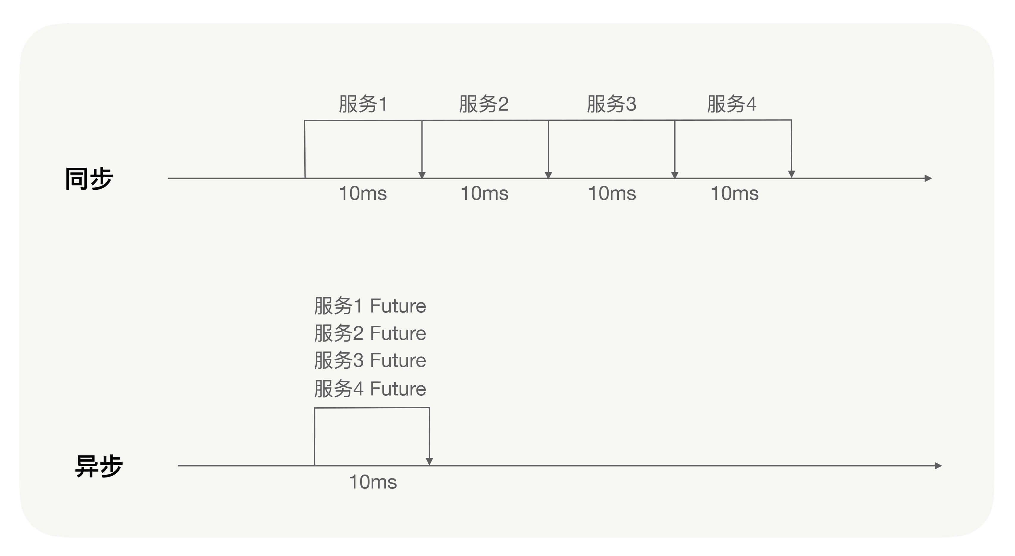 就比如刚才我提到的业务团队的那个问题,他们的业务逻辑中调用了好几个其它的服务,这时如果是同步调用,假设调用了4个服务,每个服务耗时10毫秒,那么业务逻辑执行完至少要耗时40毫秒。