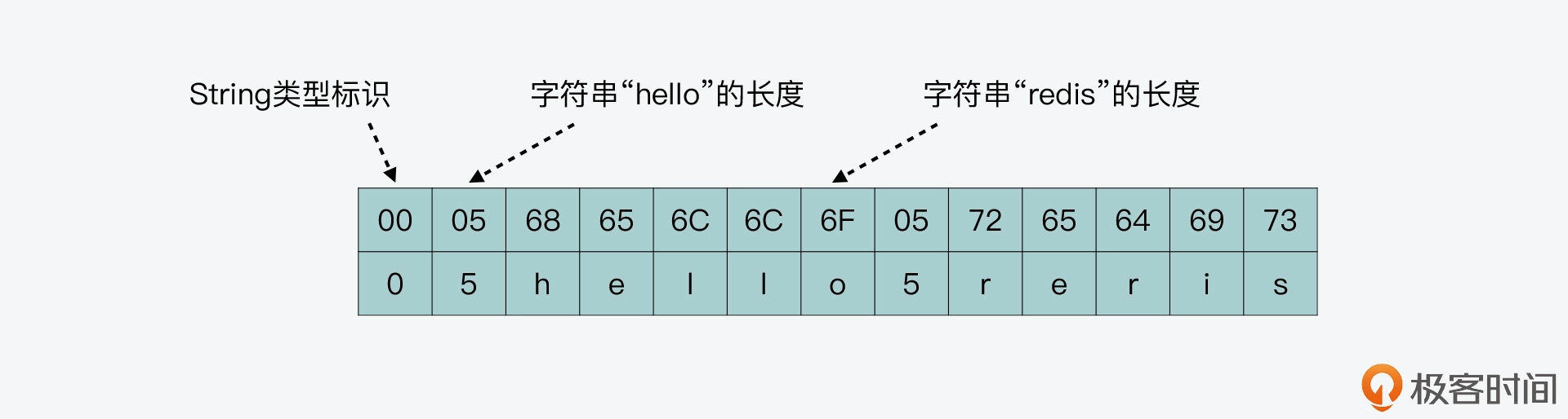 我把刚才写入的 String 类型键值对“hello”“redis”在 RDB 文件中对应的记录内容,画在了下图中,你可以看下。
