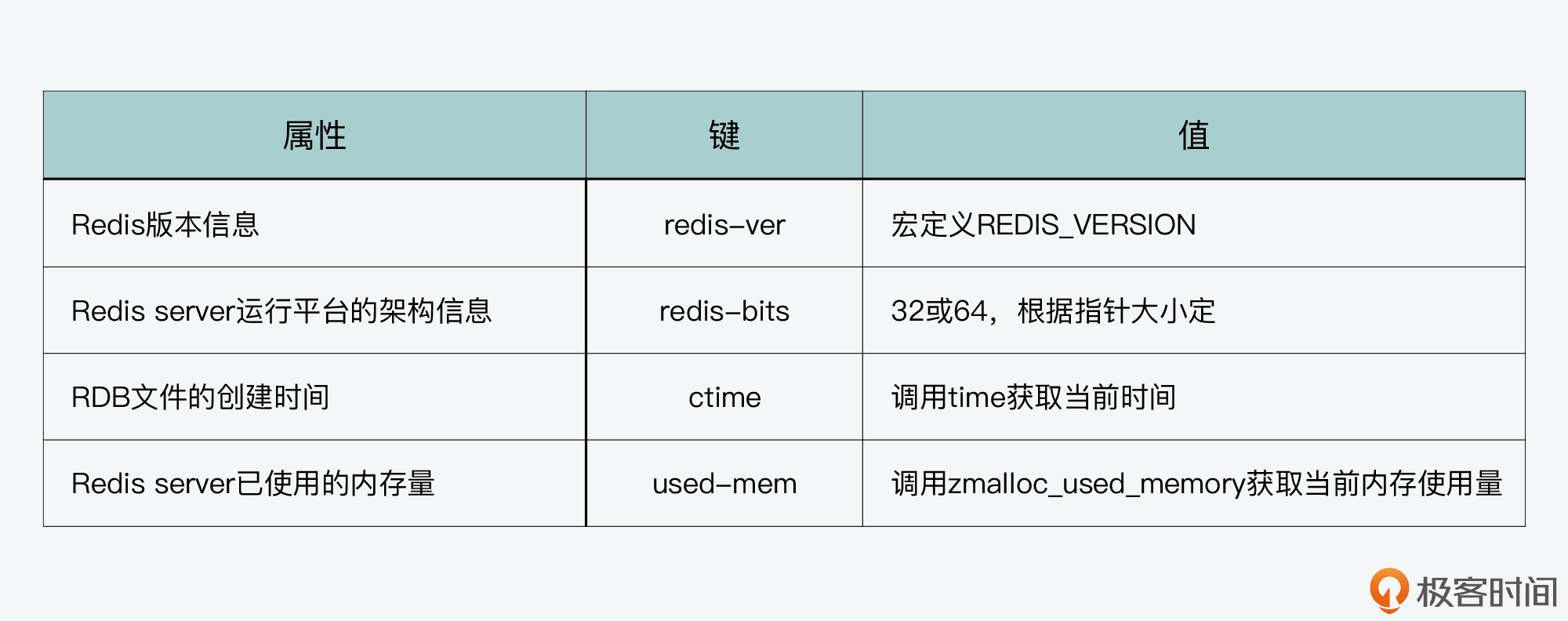 rdbSaveInfoAuxFields 函数是在 rdb.c 文件中实现的,它会使用键值对的形式,在 RDB 文件头中记录 Redis server 的属性信息。下表中列出了 RDB 文件头记录的一些主要信息,以及它们对应的键和值,你可以看下。