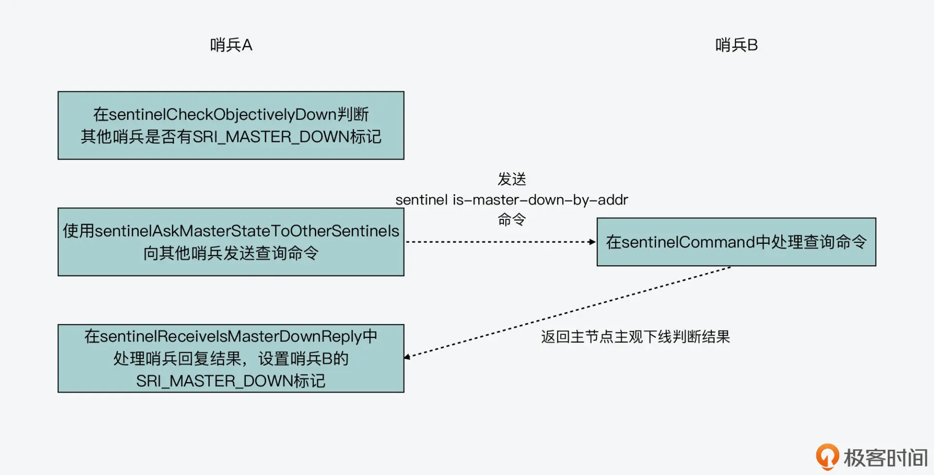 所以到这里,你就可以知道,一个哨兵调用 sentinelCheckObjectivelyDown 函数,是直接检查其他哨兵的 flags 是否有 SRI_MASTER_DOWN 标记,而哨兵又是通过 sentinelAskMasterStateToOtherSentinels 函数,向其他哨兵发送 sentinel is-master-down-by-addr 命令,从而询问其他哨兵对主节点主观下线的判断结果的,并且会根据命令回复结果,在结果处理函数 sentinelReceiveIsMasterDownReply 中,设置其他哨兵的 flags 为 SRI_MASTER_DOWN。下图也展示了这个执行逻辑,你可以再来整体回顾下。