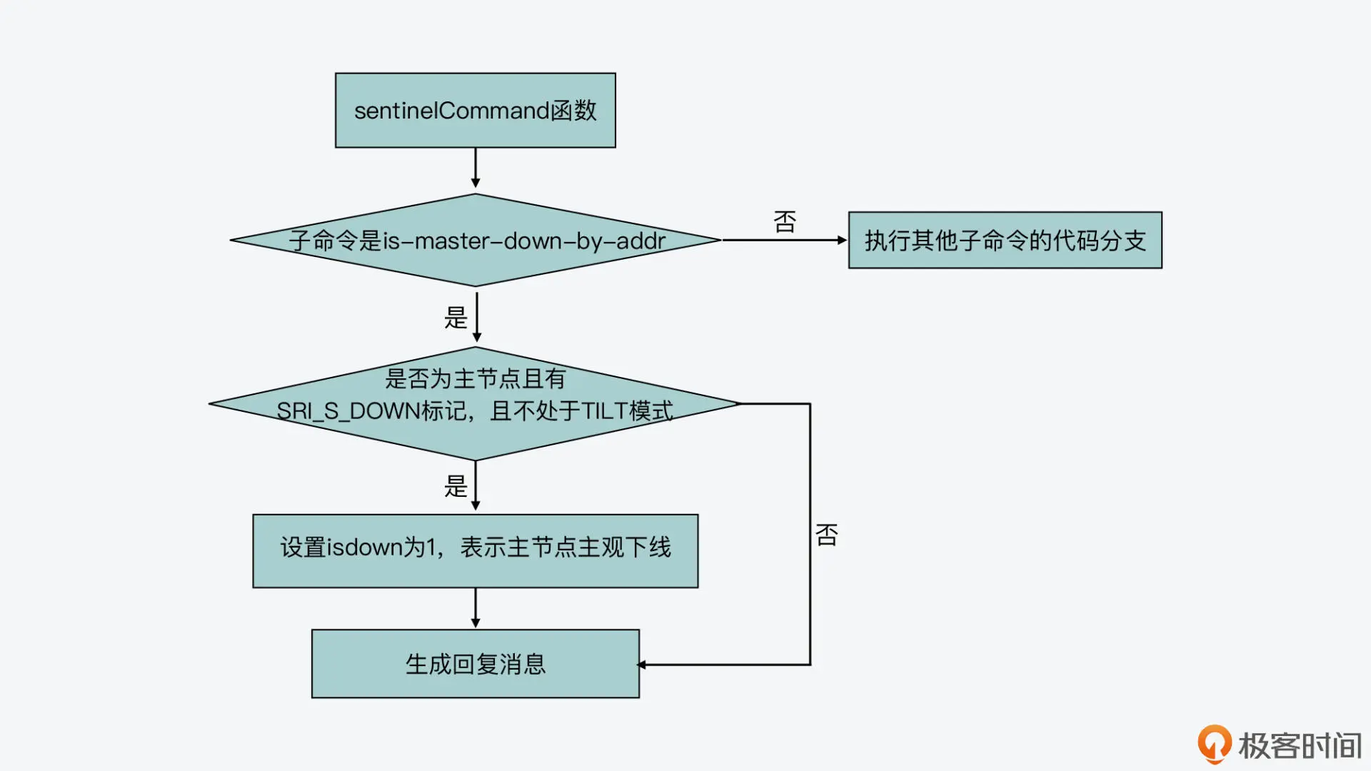 紧接着,它会判断主节点的 flags 变量中是否有 SRI_S_DOWN 和 SRI_MASTER 标记,也就是说,sentinelCommand 函数会检查当前节点是否的确是主节点,以及哨兵是否已经将该节点标记为主观下线了。如果条件符合,那么它会设置 isdown 变量为 1,而这个变量表示的就是哨兵对主节点主观下线的判断结果。