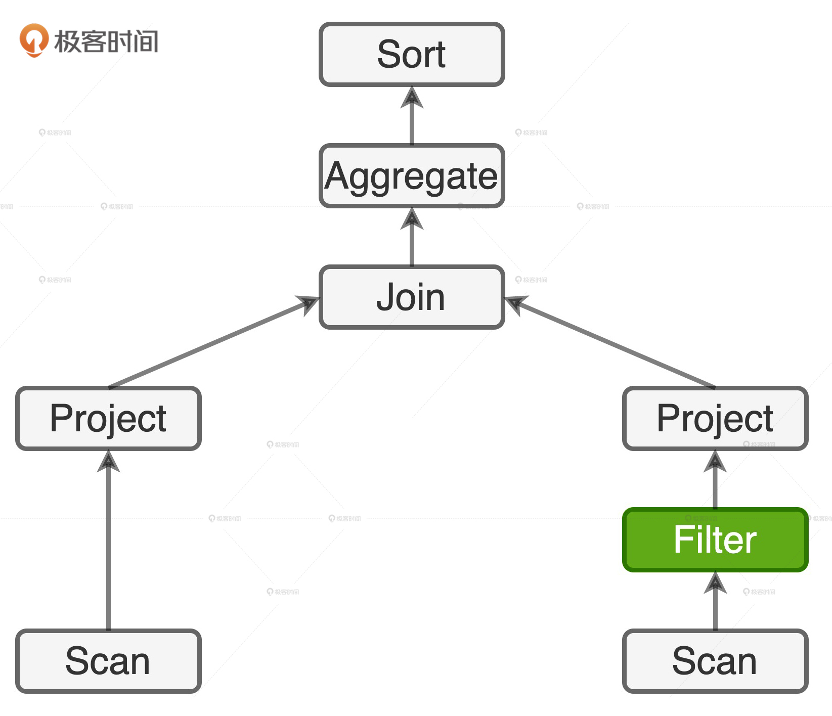 看到这样的查询语句,再结合Spark SQL那几讲学到的知识,我们很快就能画出它的逻辑执行计划。