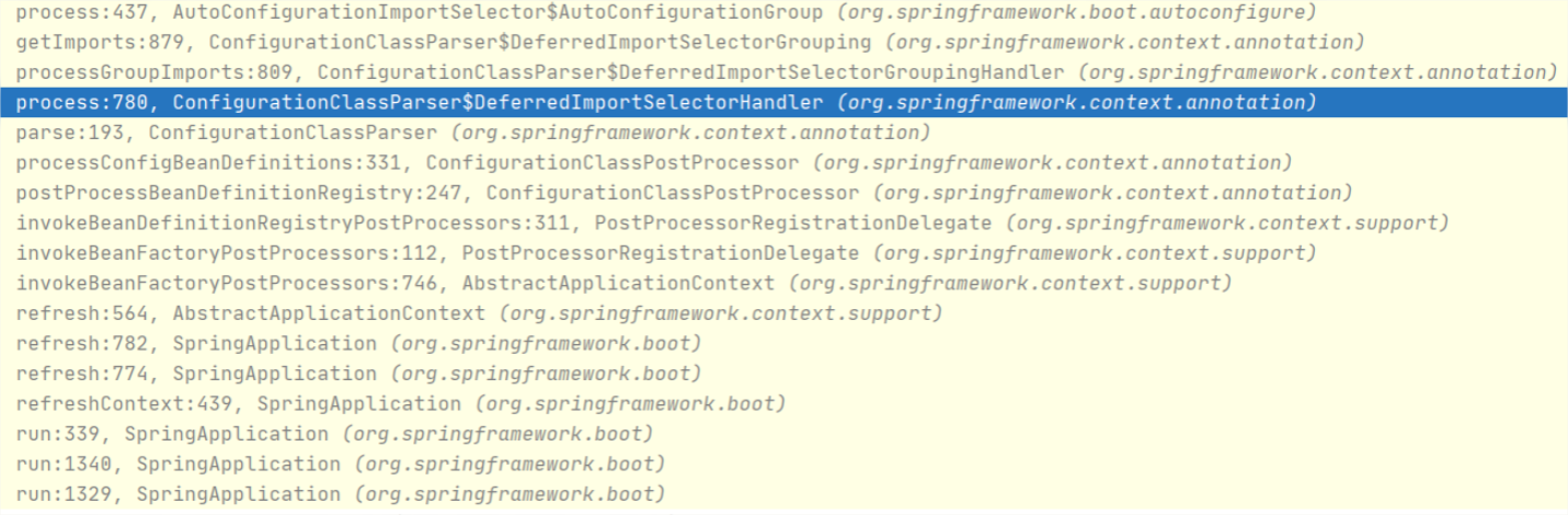 当它使用了 AutoConfigurationImportSelector 这个类,这个类就会导入在META-INF/spring.factories定义的 RedisAutoConfiguration。那么 import 动作是什么时候执行的呢?实际上是在启动应用程序时触发的,调用堆栈信息如下:
