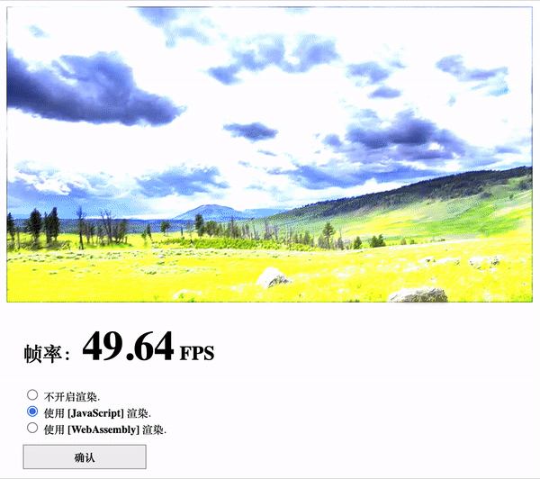再往下的一部分,便是整个应用的控制区域。在这个区域中,我们可以控制是否选择为视频添加滤镜效果。以及是使用 JavaScript 还是 Wasm 来处理滤镜的添加过程。当我们选择好某一项设置后,可以直接点击下方的“确定”按钮,使当前设置立即生效。