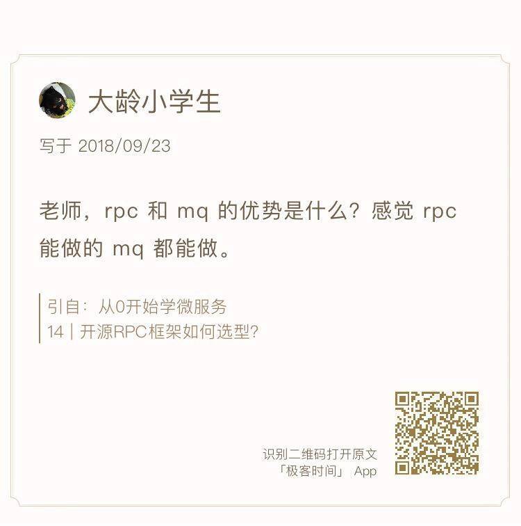 专栏里我主要讲的是基于RPC通信的微服务架构,除此之外还有一种微服务架构是基于MQ消息队列通信的,下面我就从这两种架构不同的适用场景来给你讲讲它们的区别。