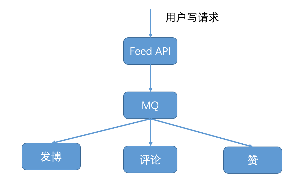 而基于MQ消息队列通信的架构,其特点是服务之间的交互是通过消息发布与订阅的方式来完成的,一个服务往MQ消息队列发布消息,其他服务从MQ消息队列订阅消息并处理,发布消息的服务并不等待订阅消息服务处理的结果,而是直接返回调用成功。这种架构适用于用户请求是写请求的情况,就像下图所描述的那样,比如用户的写请求,无论是发博、评论还是赞都会首先调用Feed API,然后Feed API将用户的写请求消息发布到MQ中,然后就返回给用户请求成功。如果是发博请求,发博服务就会从MQ中订阅到这条消息,然后更新用户发博列表的缓存和数据库;如果是评论请求,评论服务就会从MQ中订阅到这条消息,然后更新用户发出评论的缓存和数据库,以及评论对象收到评论的缓存和数据库;如果是赞请求,赞服务就会从MQ中订阅到这条消息,然后更新用户发出赞的缓存和数据库,以及赞对象收到的赞的缓存和数据库。这样设计的话,就把写请求的返回与具体执行请求的服务进行解耦,给用户的体验是写请求已经执行成功,不需要等待具体业务逻辑执行完成。