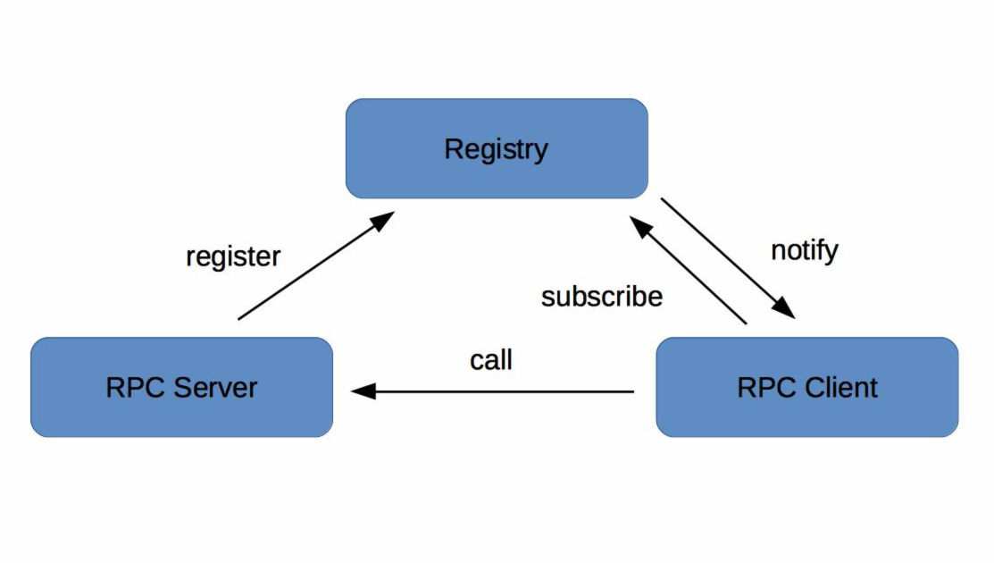 在微服务架构下,主要有三种角色:服务提供者(RPC Server)、服务消费者(RPC Client)和服务注册中心(Registry),三者的交互关系请看下面这张图,我来简单解释一下。