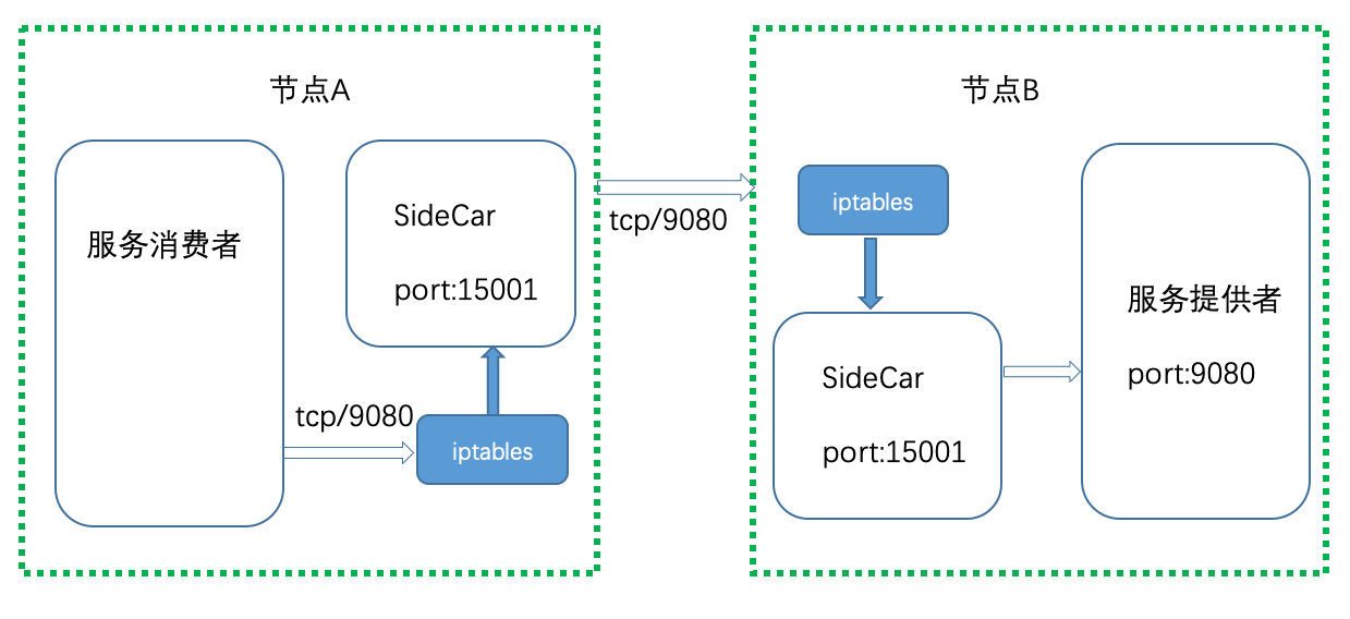我们可以把服务消费者节点上的SideCar叫作正向代理,服务提供者节点上的SideCar叫作反向代理,那么Service Mesh架构的关键点就在于服务消费者发出的请求如何通过正向代理转发以及服务提供者收到的请求如何通过反向代理转发。从我的经验来看,主要有两种实现方案。