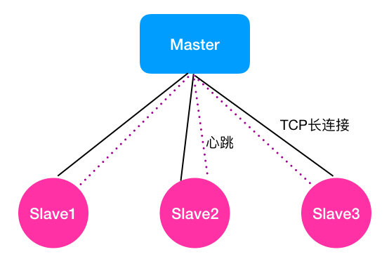 如下图所示,假设Master节点与3个Slave节点相连。请注意,我在图中,Master与Slave之间画了两条线,实线旁写的是TCP长连接,虚线旁写的是心跳。因为Master与Slave之间的监控关系是固定的,因此我用了两种机制协同来判断Slave是否存活。