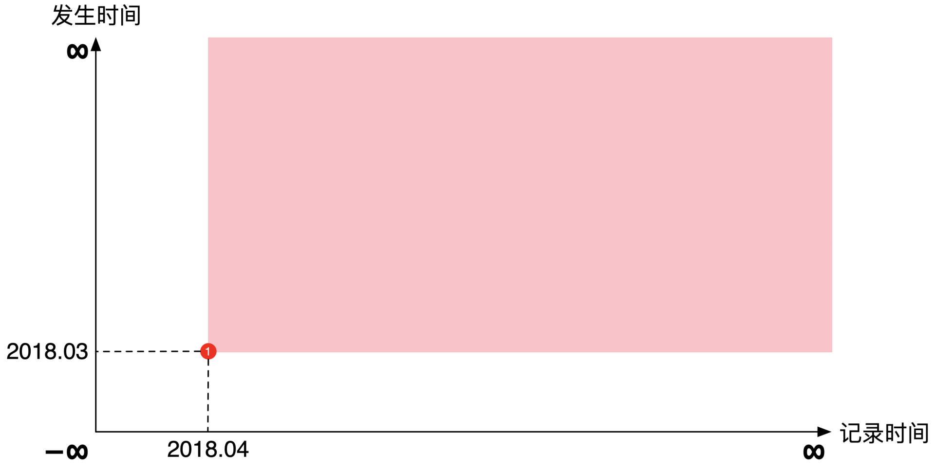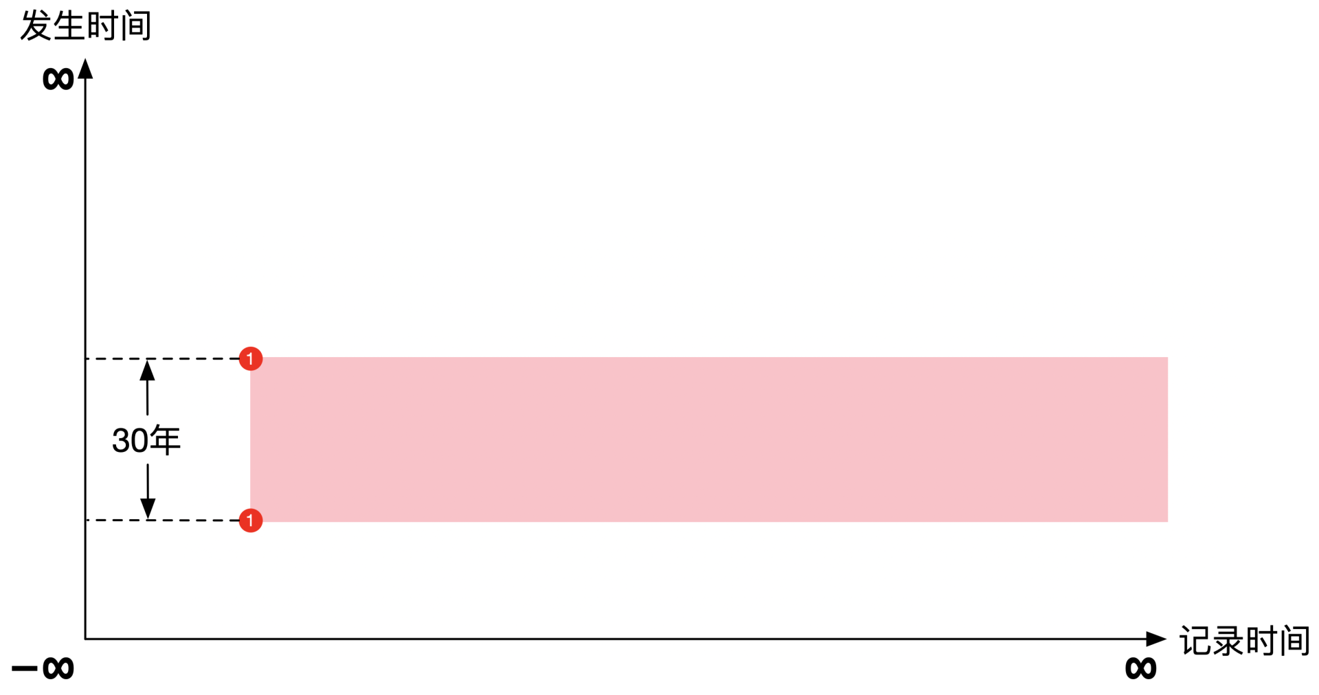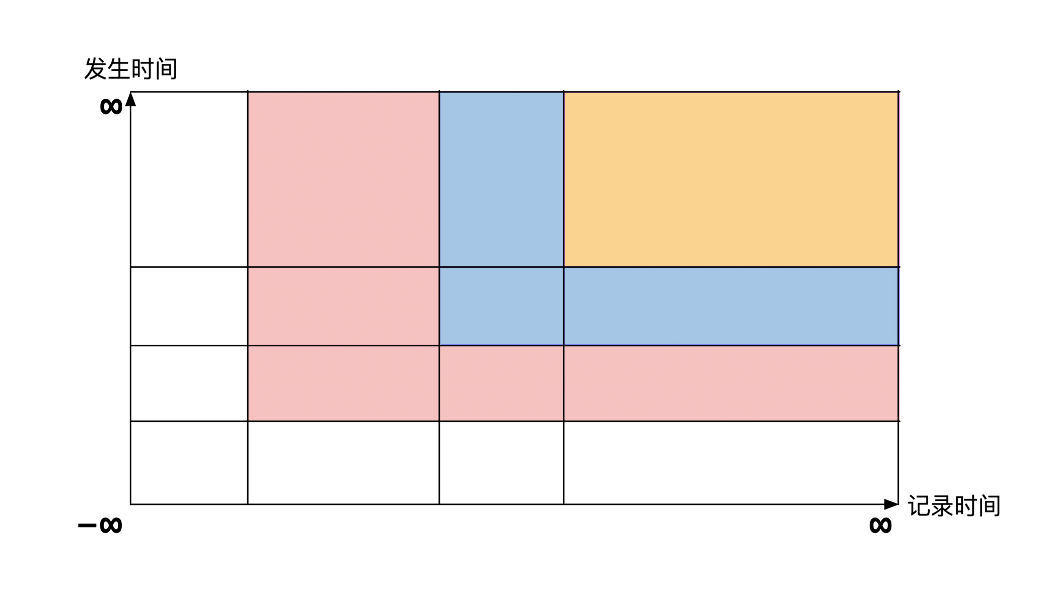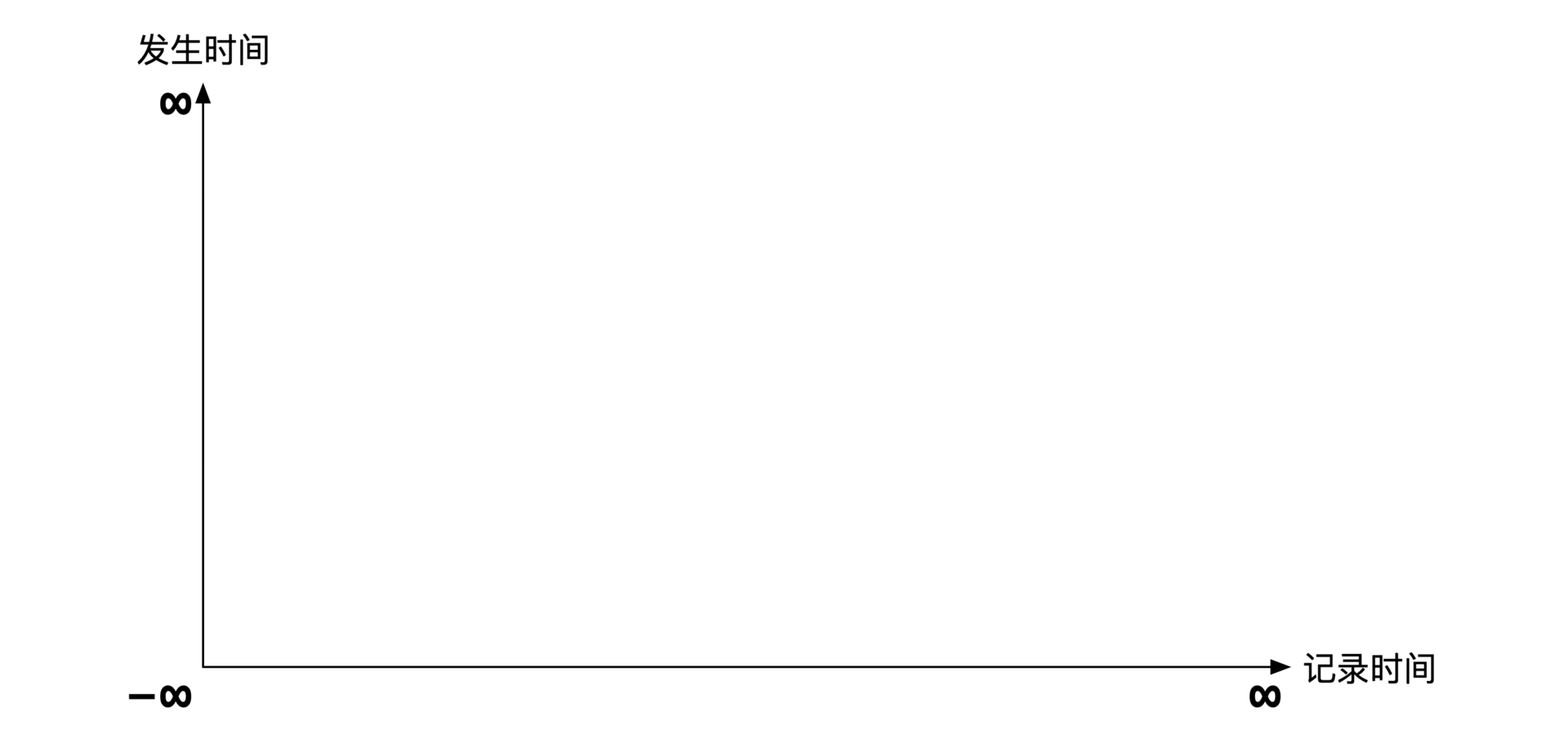 按照行业惯例,横轴是记录时间,纵轴是发生时间。理论上每个轴都指向正负无穷远,但是在实际展示中通常将坐标原点表示为负无穷远,主要是为了画起来好看。示意图如下: