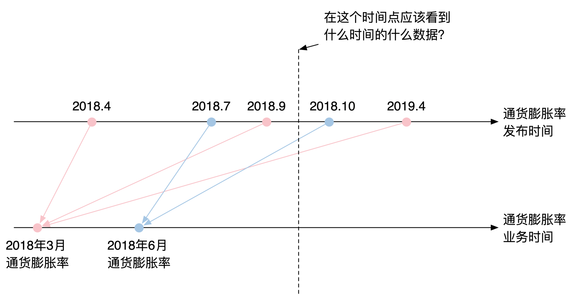 最开始提到的第二个问题也有了答案。如果你想知道每次对2018年3月的通货膨胀率的修改究竟会带来什么影响,就需要保持2018年3月这个发生时间不变,然后依次调整记录时间。这样就能保证你只更新了2018年3月的数据,而没有意外地用到其他月份的数据。